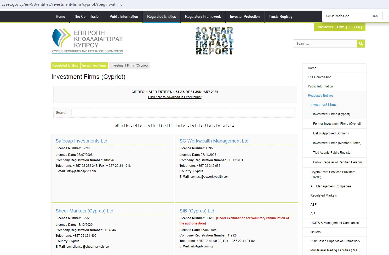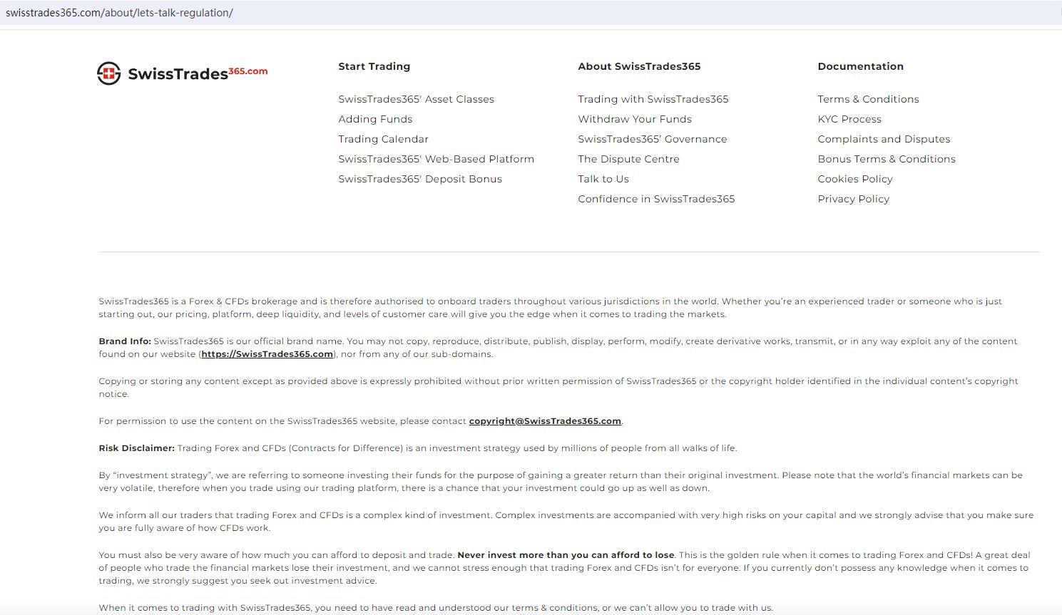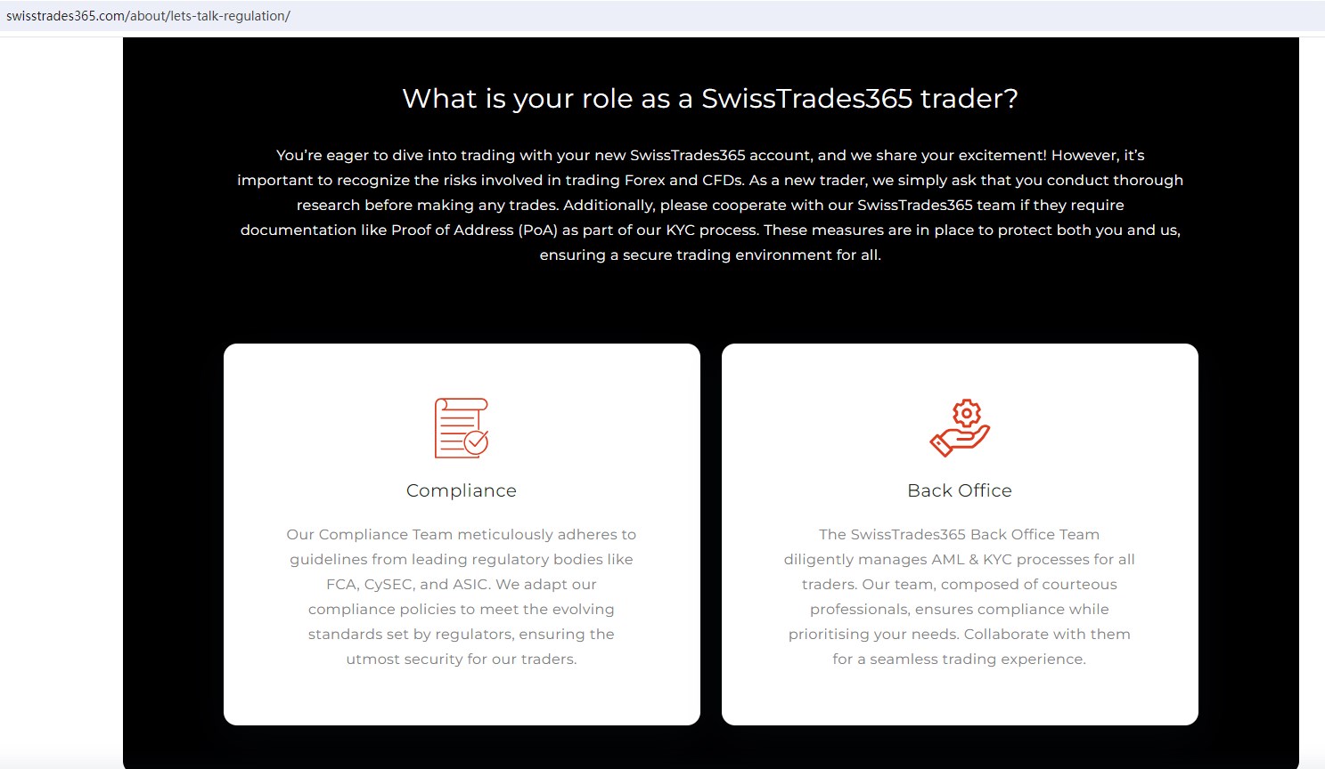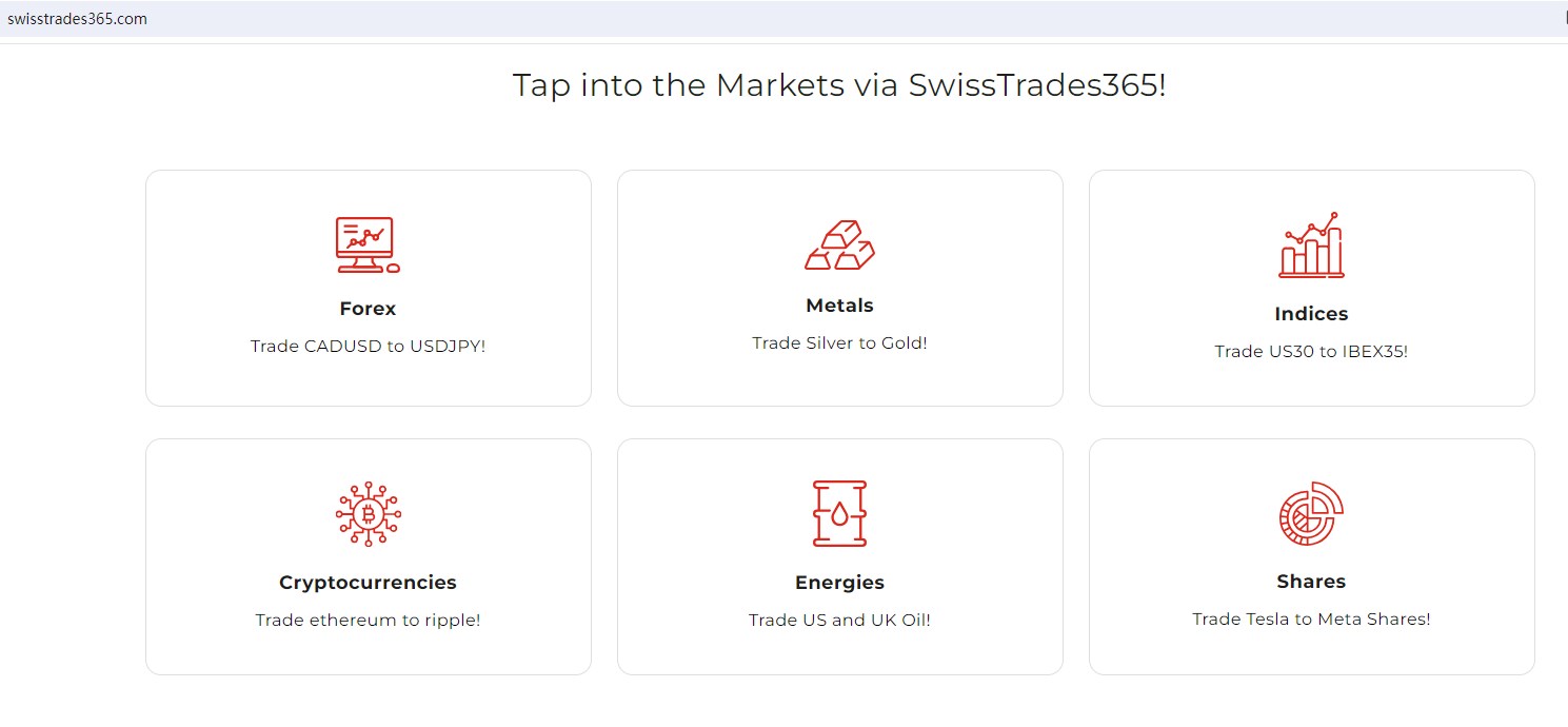 SwissTrades365 claims to be a Forex & CFDs brokerage, offering wide range of financial services, including Forex, Metals, Indices, Cryptocurrencies, Energies, Shares and more instruments in global markets, and adheres to guidelines from leading regulatory bodies like the United Kingdom Financial Conduct Authority (FCA), the Cyprus Securities and Exchange Commission (CySEC), and the Australian Securities & Investment Commission (ASIC).