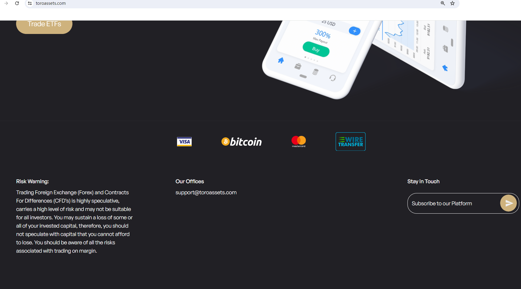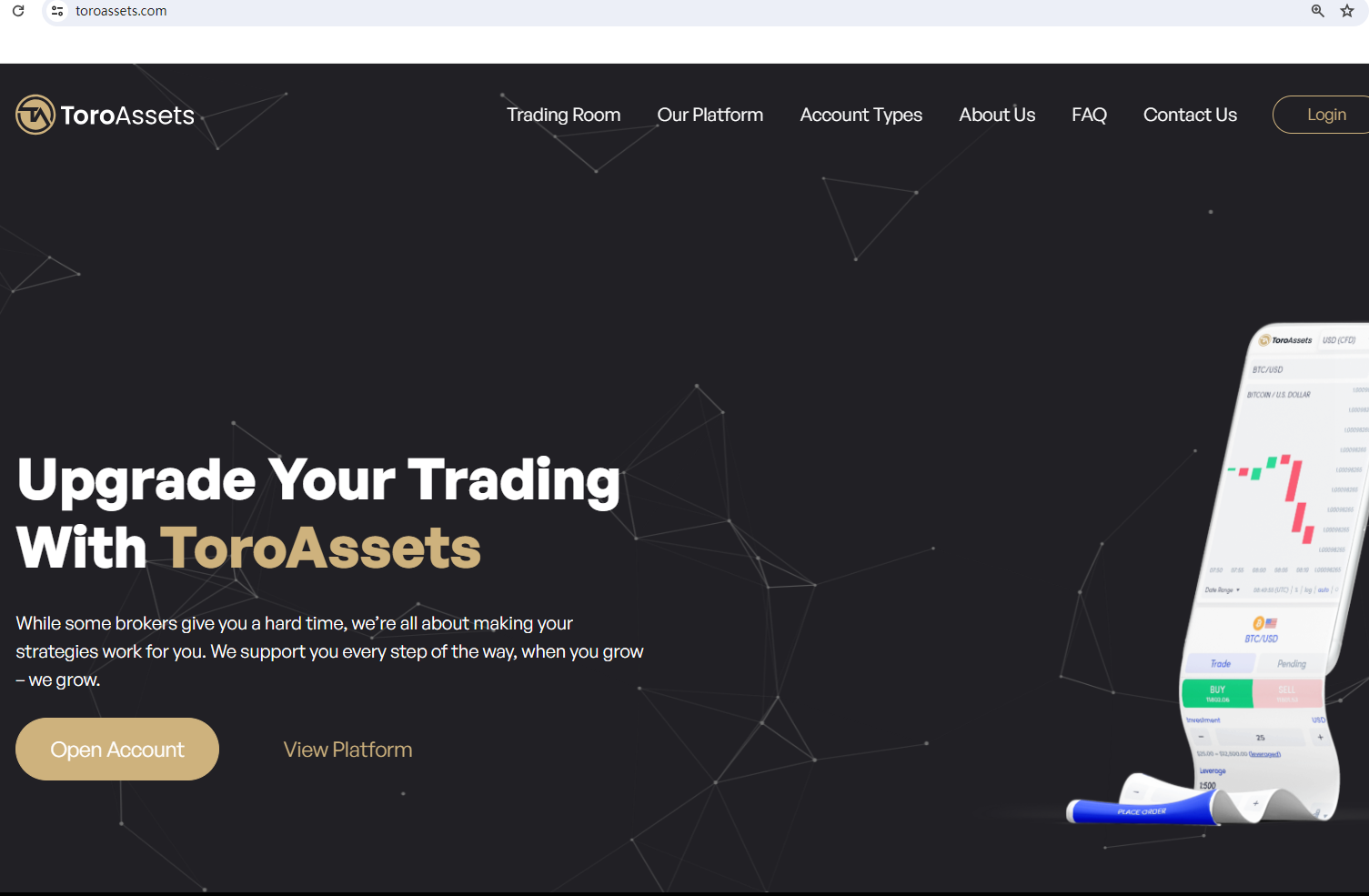 TOROASSETS claims to be a reliable company without presenting any information about its regulation or contact. The lack of such important information may be a distinct signal of an unlicensed broker, as regulated companies always present their accreditations and licenses in a prominent position. It is a red flag.