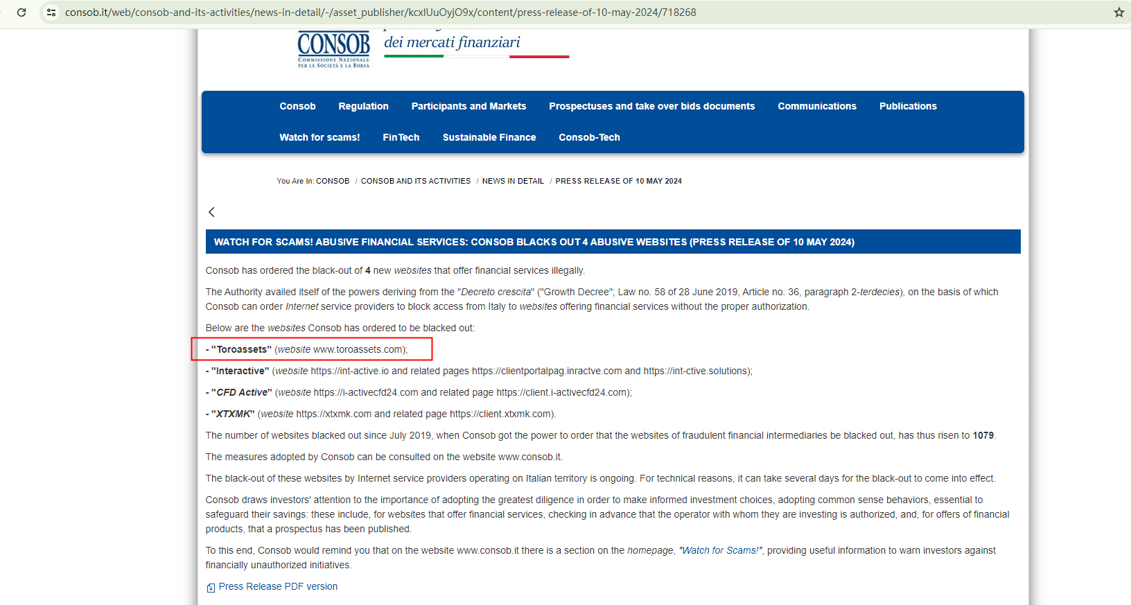 On May 10, 2024, the Italian Companies and Exchange Commission (CONSOB) ordered TOROASSETS' website to be blacked out since it offers financial services illegally in Italy. https://www.consob.it/web/consob-and-its-activities/news-in-detail/-/asset_publisher/kcxlUuOyjO9x/content/press-release-of-10-may-2024/718268