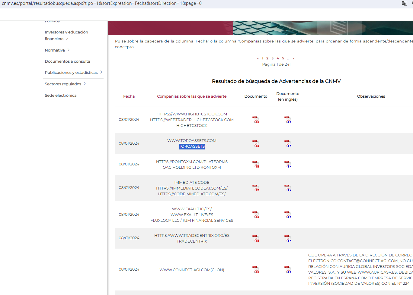 • 2024-01-09 The CNMV issued a Warning against TOROASSETS