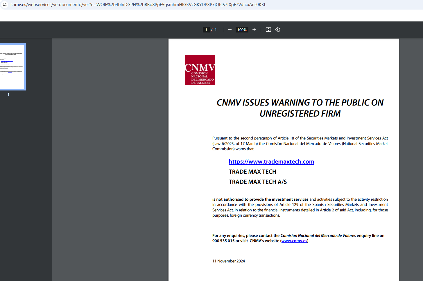 In addition, the Comisión Nacional del Mercado de Valores (CNMV) has added TRADE MAX TECH to its warning list for providing investment services without authorization.