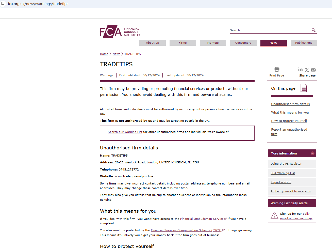 In aadition, it is located in the UK. Upon investigation, we found that the Financial Conduct Authority (FCA) issued a warning against TRADETIPS, believing this company might be providing financial services or products without proper authorization in the UK.