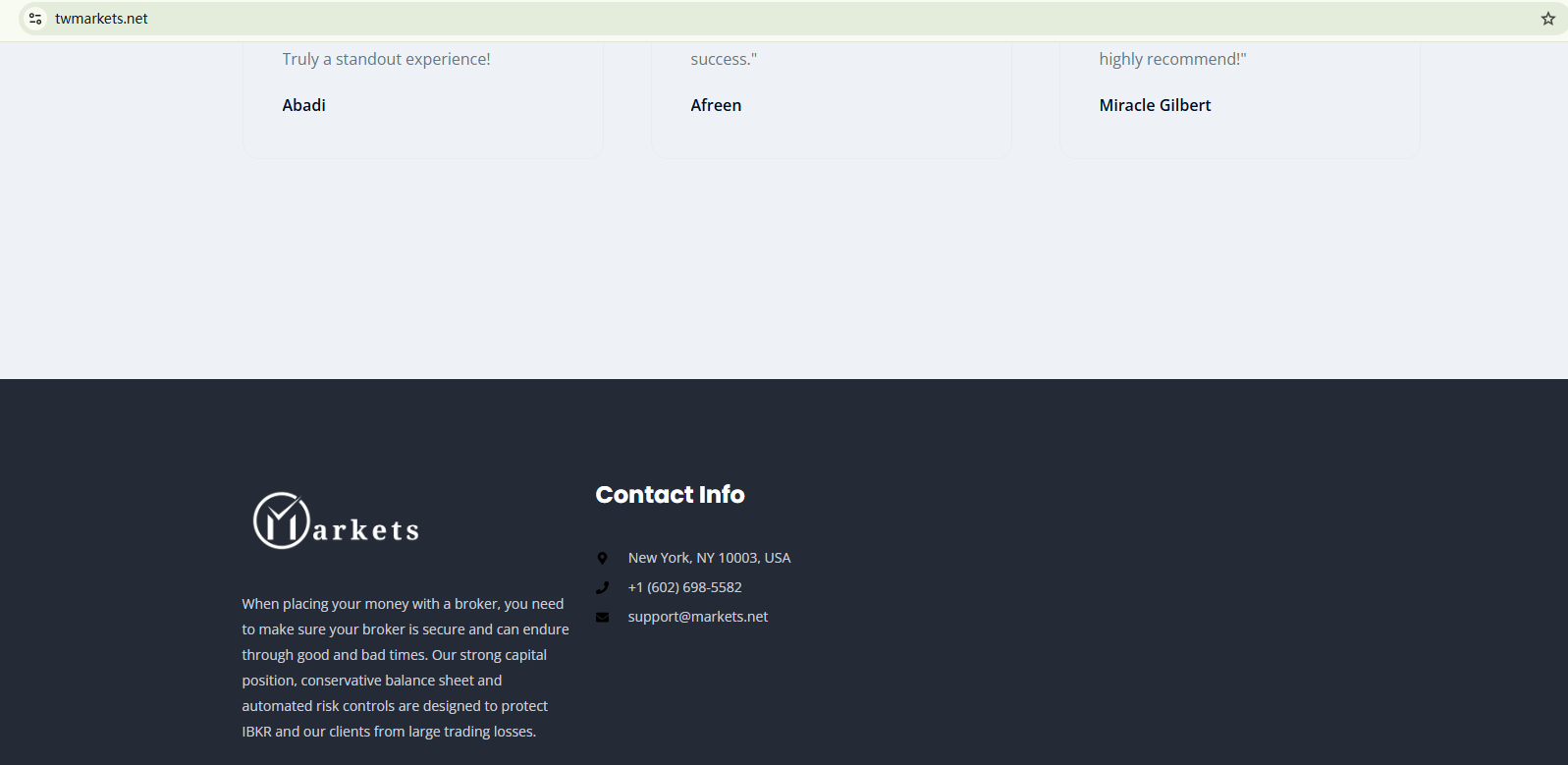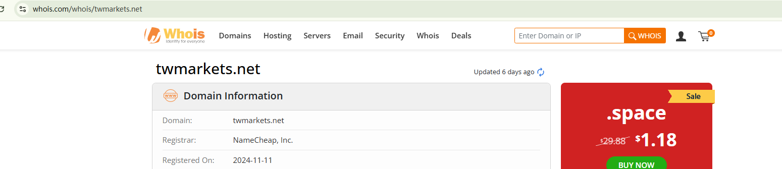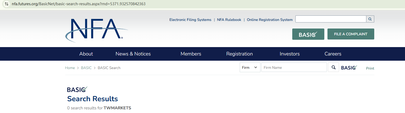 TWMarkets' domain was registered in November 2024, making it a relatively new website. The content on the site is limited, with most of it consisting of exaggerated claims promoting its business. We have not found useful information to substantiate the broker's legitimacy and compliance. While the footer lists a physical address for contact, the contact information is inadequate and not detailed. Despite claiming to be based in the US, TWMarkets has not registered as a member of the National Futures Association (NFA), meaning it is operating out of the US without authorization or supervision.