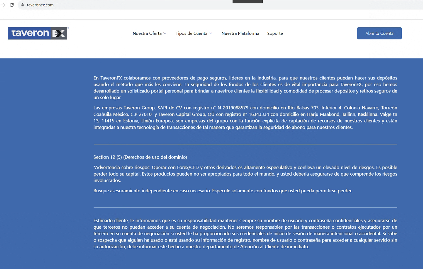 TaveronFX claims to be a reliable company without presenting any information about its regulation or contact. The lack of such important information may be a distinct signal of an unlicensed broker, as regulated companies always present their accreditations and licenses in a prominent position. It is a red flag.