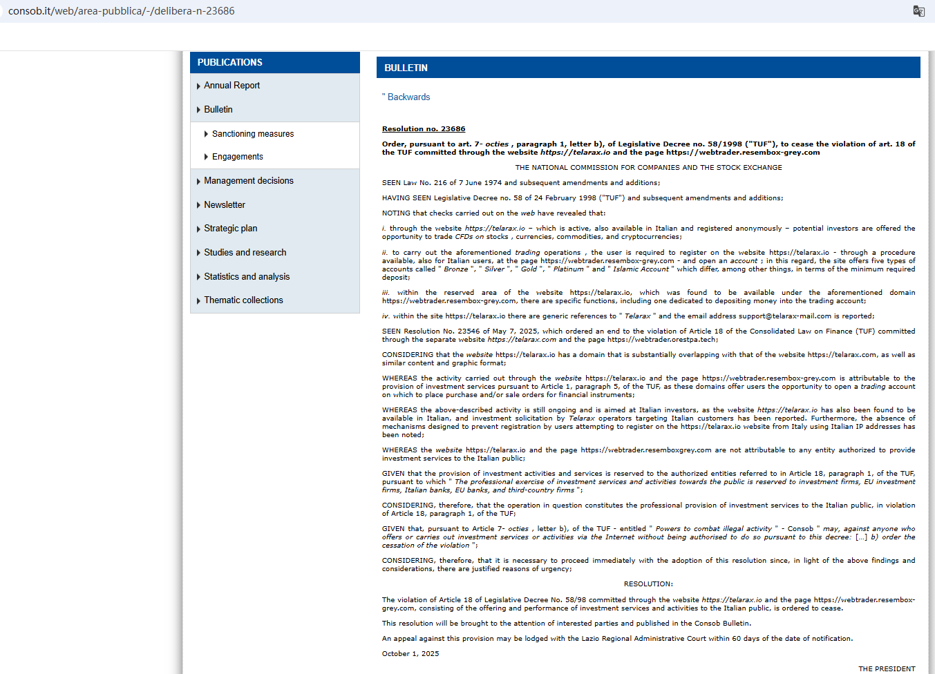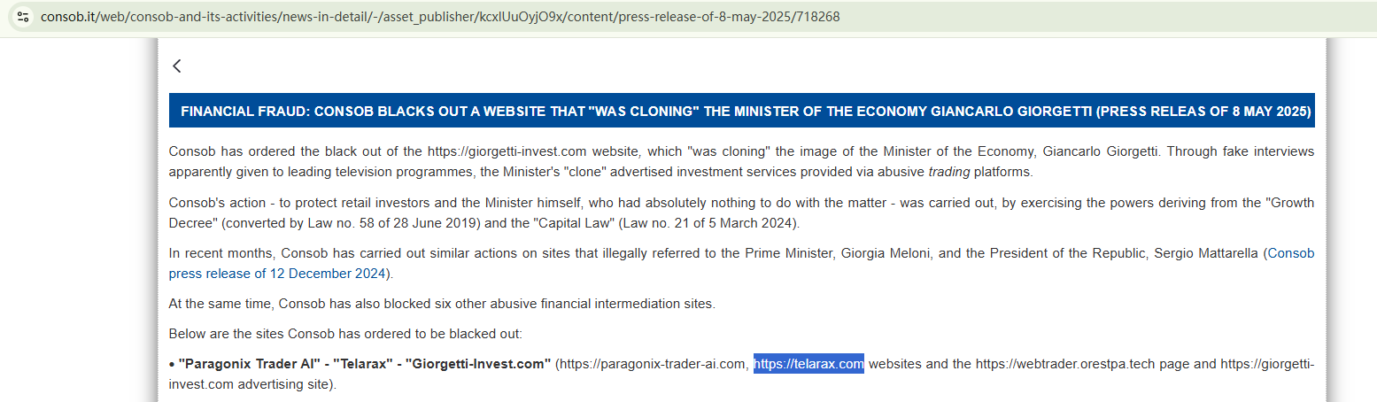 In addition, the Italian Companies and Exchange Commission (CONSOB) has ordered Telarax's website to be blacked out since it offers financial services illegally.