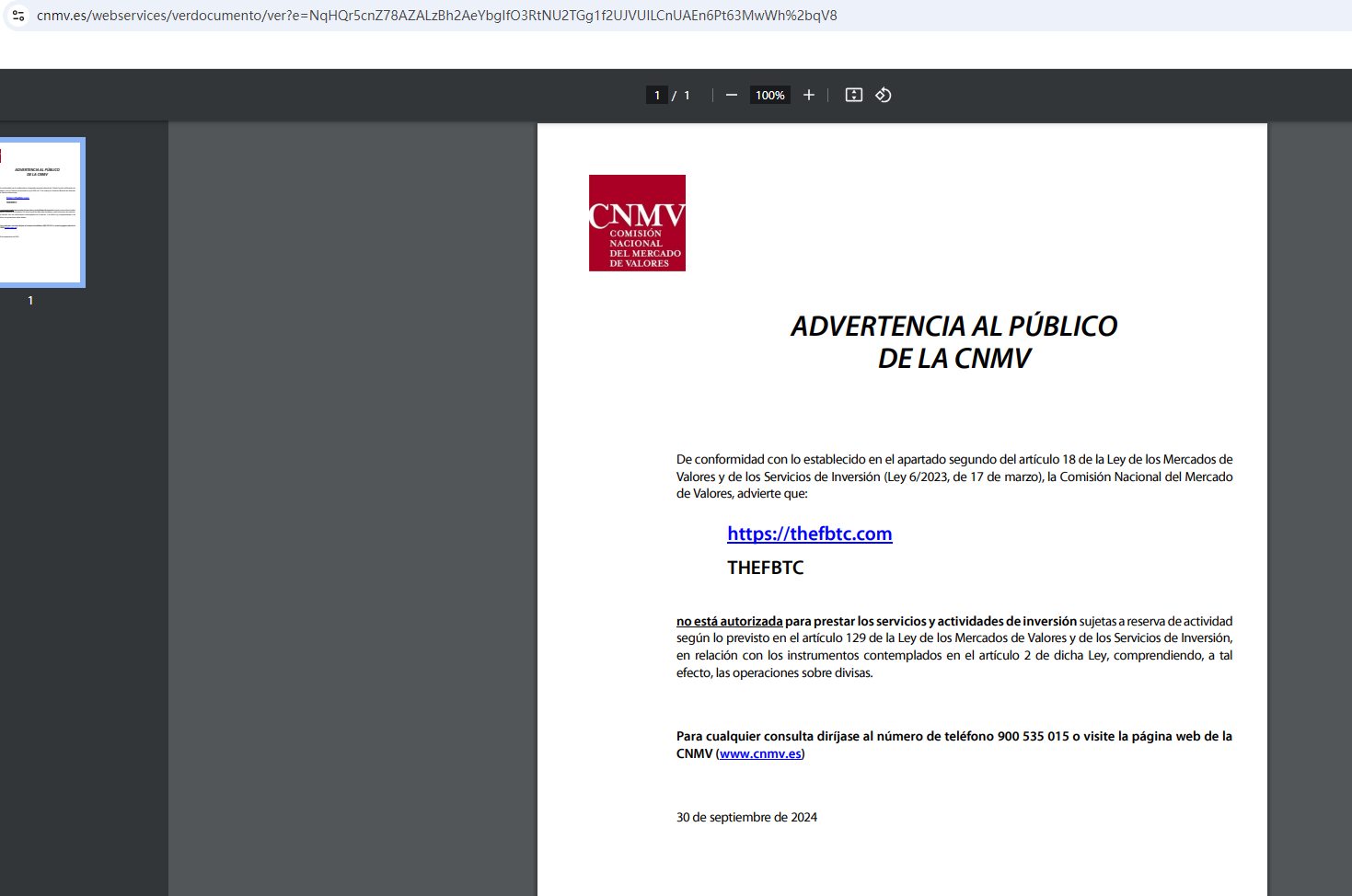 In addition, the Comisión Nacional del Mercado de Valores (CNMV) issued a warning that TheFBTC was providing financial services or products without authorisation.