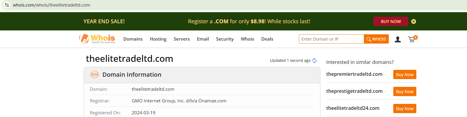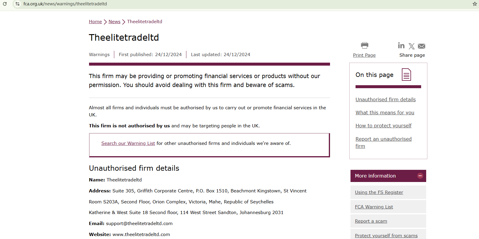 Theelitetradeltd doesn't provide any valid details about its true identity, making itself untraceable in the event of issues. Contradictory to its claim of having started business since 2012, its domain name was just registered in March 2024. The Financial Conduct Authority (FCA) has issued a warning against Theelitetradeltd for the lack of the required authorization.