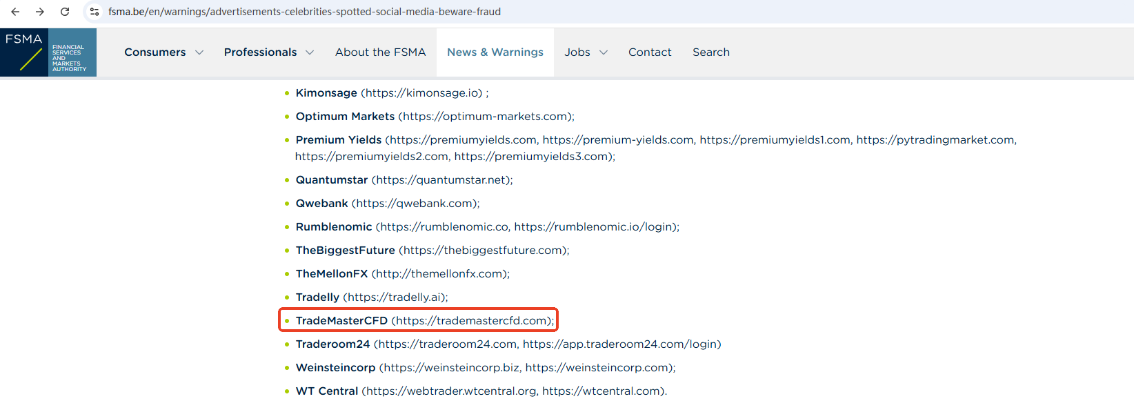 On 15 November 2024, The Financial Services and Markets Authority (FSMA) issued a warning against TradeMasterCFD, believing this company might be providing financial services or products without authorisation in Belgium. You may visit: https://www.fsma.be/en/warnings/advertisements-celebrities-spotted-social-media-beware-fraud.