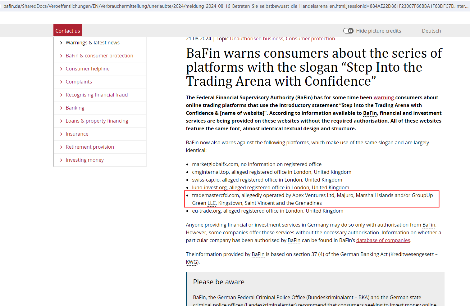 On August 21, 2024, the Federal Financial Supervisory Authority (BaFin) warned consumers about the website trademastercfd.com, stating that the financial and investment services are being provided on this website without the required authorization. https://www.bafin.de/SharedDocs/Veroeffentlichungen/EN/Verbrauchermitteilung/unerlaubte/2024/meldung_2024_08_16_Betreten_Sie_selbstbewusst_die_Handelsarena_en.html;jsessionid=884AE22D861F23007F66BBA1F68DFC7D.internet001