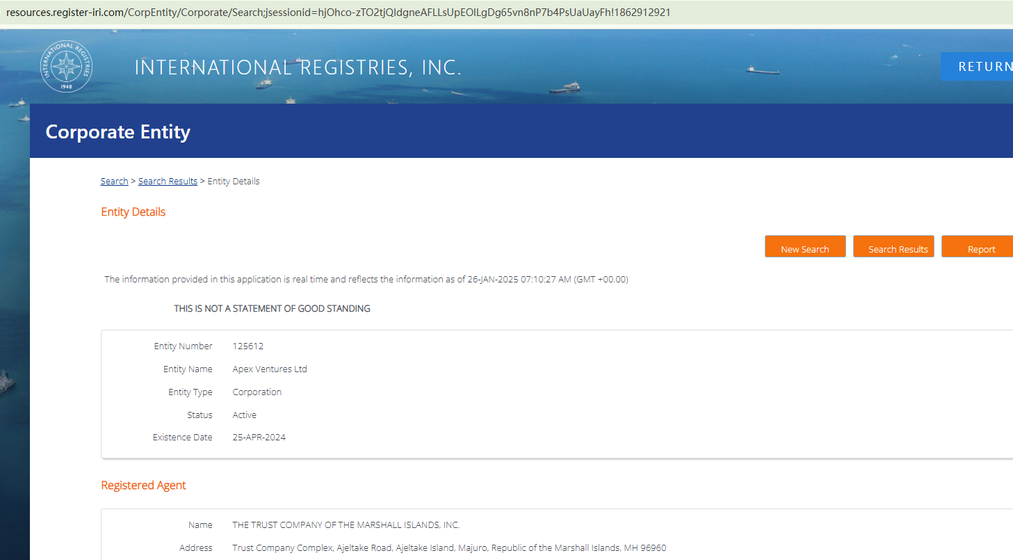 According to its website, it is located in Marshall Islands. Upon investigation, no matching information was found in the Marshall Islands Registry (IRI).