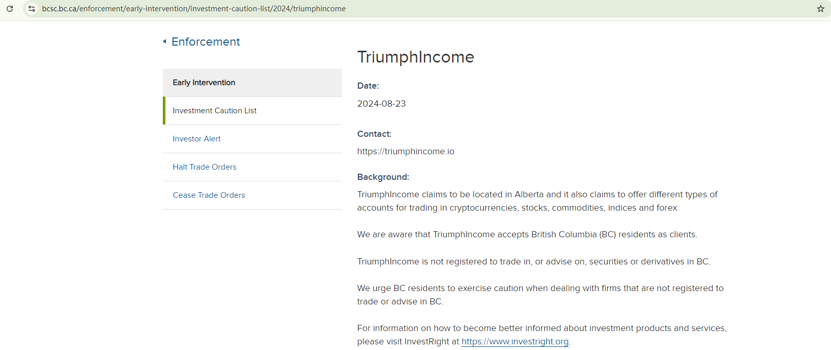 TriumphIncome doesn't provide any licensing details to substantiate its legitimacy. This lack of essential information is a red flag. While it claims to be located in Canada, there are no indications that it is authorized or regulated by the Investment Industry Regulatory Organization of Canada (IIROC). In addition, the British Columbia Securities Commission (BCSC) has issued a warning against TriumphIncome, stating that this broker is not registered to trade in, or advise on, securities or derivatives in BC.
