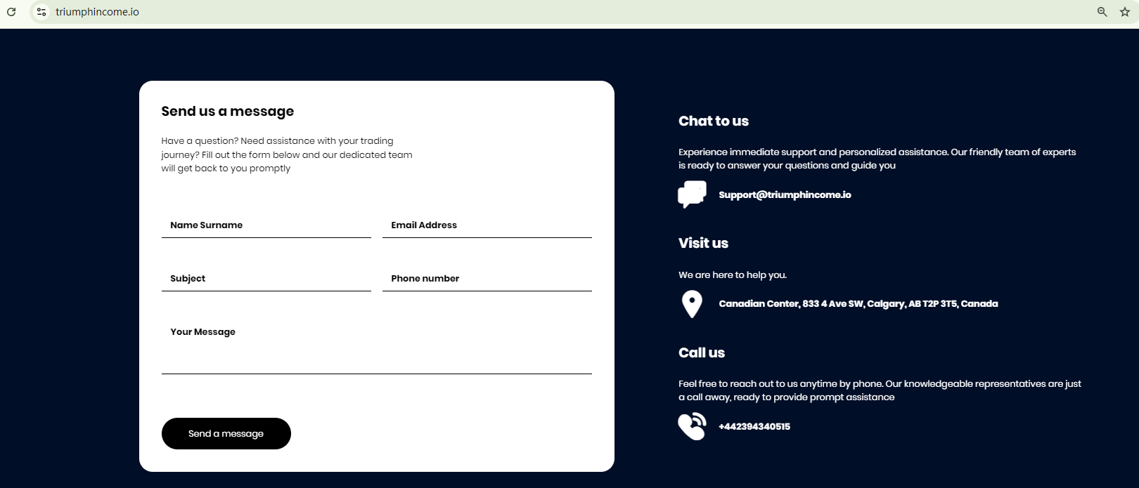 TriumphIncome doesn't provide any licensing details to substantiate its legitimacy. This lack of essential information is a red flag. While it claims to be located in Canada, there are no indications that it is authorized or regulated by the Investment Industry Regulatory Organization of Canada (IIROC). In addition, the British Columbia Securities Commission (BCSC) has issued a warning against TriumphIncome, stating that this broker is not registered to trade in, or advise on, securities or derivatives in BC.In essence, TriumphIncome is not regulated by any governing body. Entrusting it with investors' funds is highly risky, as there are no legal protections in place to safeguard the funds.TriumphIncome appears to be a scam.