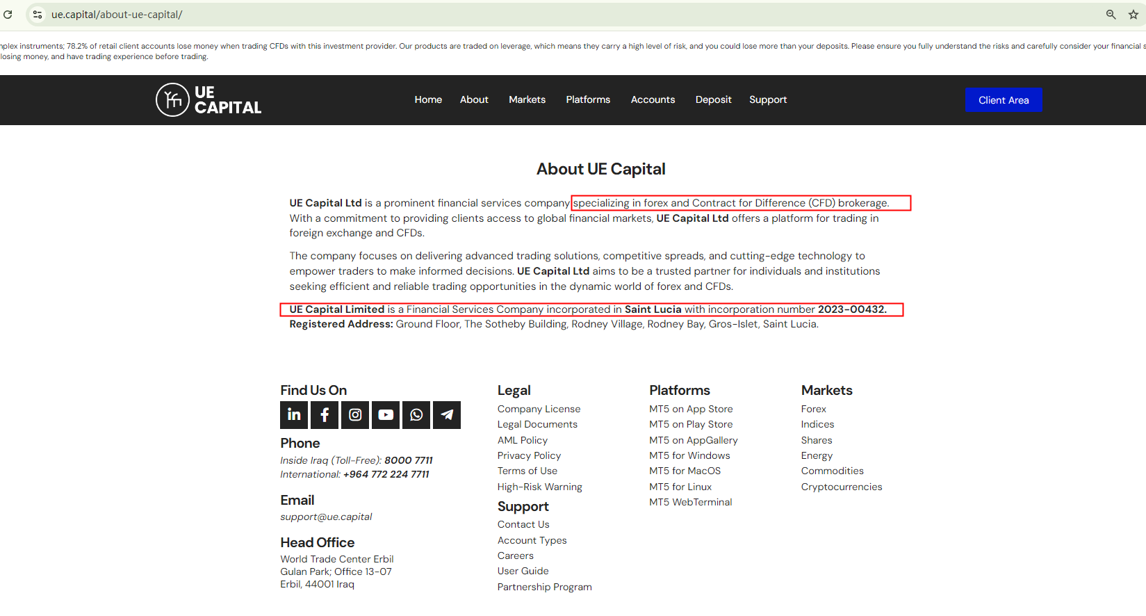 UE Capital merely claims to be registered in St. Lucia, whose financial regulator has stated that forex trading activities are not licensed in the country. Since the broker fails to provide other valid evidence of its legitimacy, we can conclude that UE Capital is an unregulated broker.