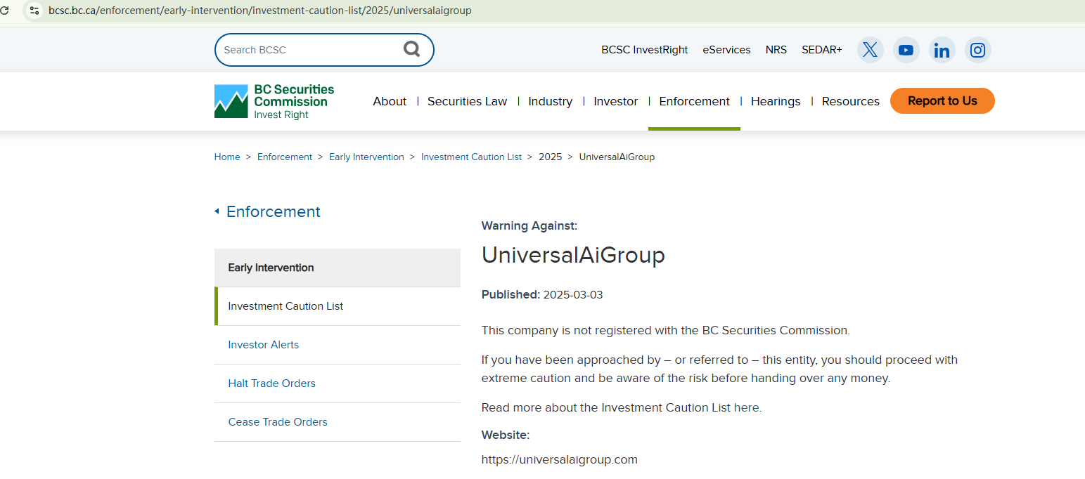 • Mar 02, 2025 The BCSC issues a warning against UniversalAiGroup