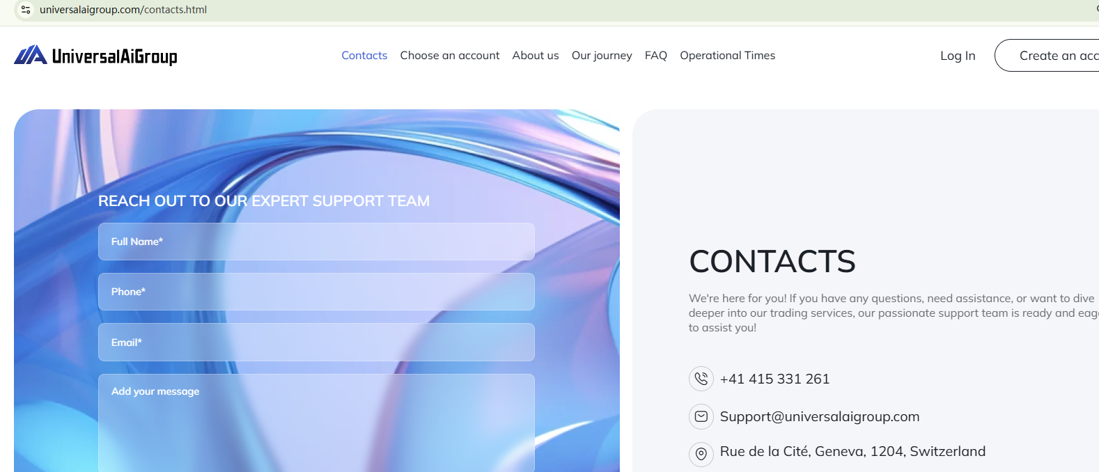 UniversalAiGroup presents itself as an established broker. However, its domain name was only registered in December 2024, raising doubts about its credibility. The company does not provide any substantial information regarding its legitimacy or regulatory status. The supposed office address in Switzerland is shared by numerous firms and can be used as a virtual office. Furthermore, the British Columbia Securities Commission (BCSC) has issued a warning against UniversalAiGroup, stating that this broker is not registered to trade in, or advise on, securities or derivatives in BC.