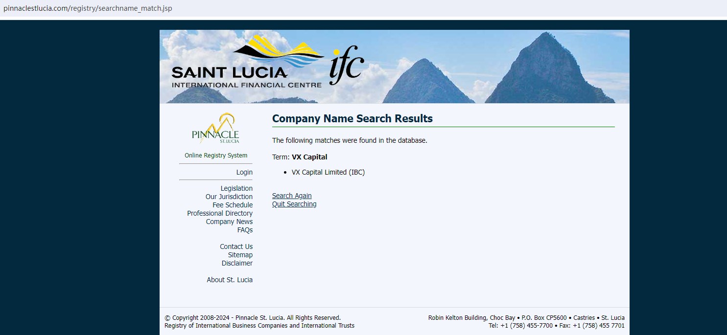 Upon investigation, we found that VX Capital Limited is registered with the International Financial Centre (IFC) in Saint Lucia, an International Business Companies Registry that doesn't license forex trading brokerage activities.