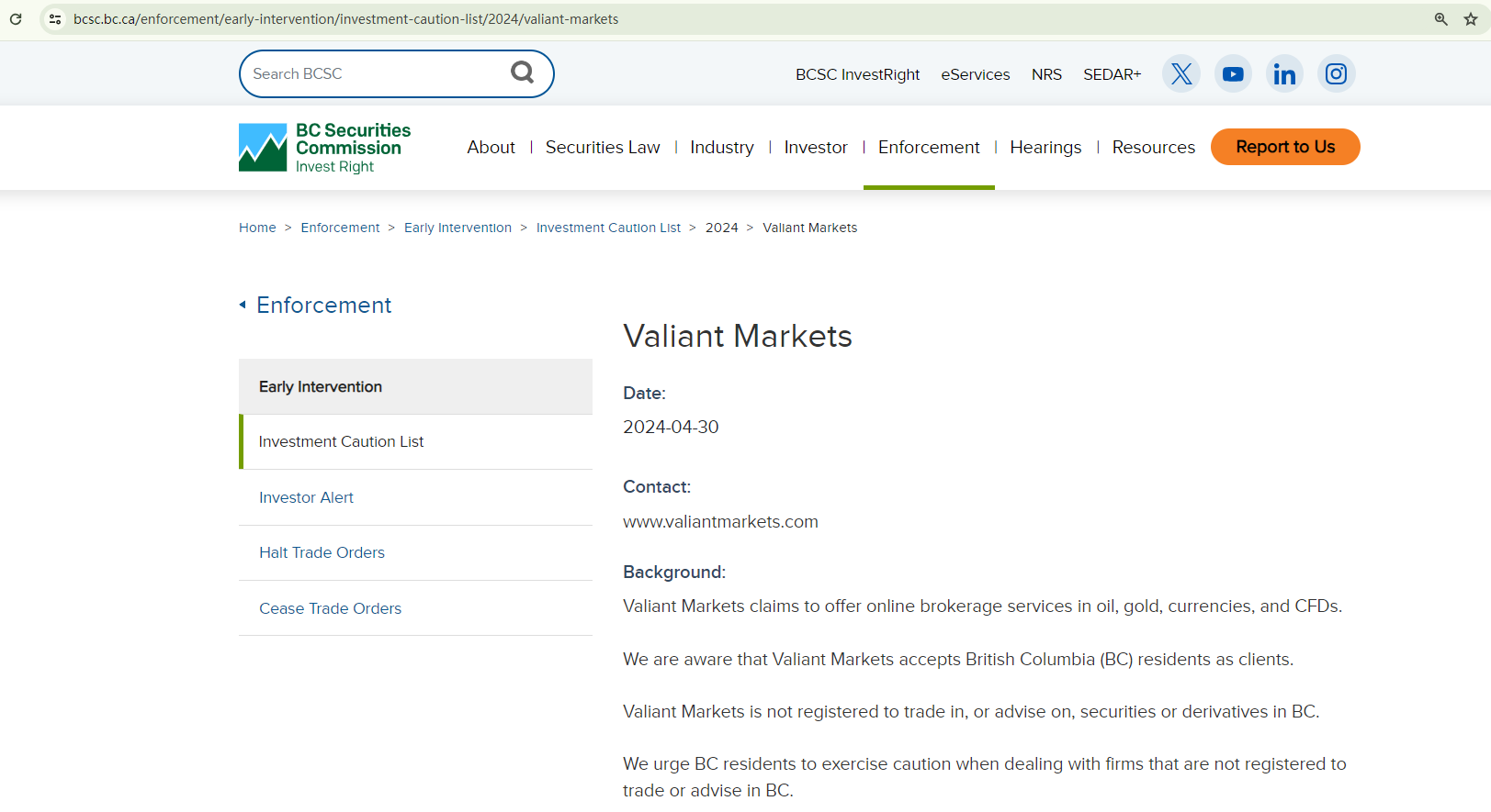ANSWER No, Valiant Markets is not reliable.This broker lacks transparency, failing to provide essential company and licensing information for investors to verify its authenticity and legitimacy. This is a red flag for potential fraudulent activities. What's more, the British Columbia Securities Commission (BCSC) has issued a warning against Valiant Markets, stating that this broker is not registered to trade in, or advise on, securities or derivatives in BC. This further underscores the associated risks.Given these facts, we strongly suggest investors stay away from Valiant Markets to protect themselves from fraud and identity theft. It is recommended choosing fully regulated brokers.