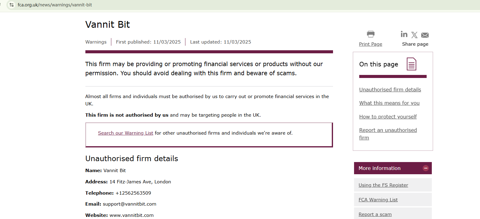 The domain name of Vannit Bit was first registered in June 2024. This recent domain registration, coupled with the use of a website template commonly associated with fraudulent investment activities, serves as a red flag for potential scams. Vannit Bit doesn't provide any information about its regulatory status. In addition, the Financial Conduct Authority (FCA) has issued a warning against Vannit Bit for the lack of the required authorization.