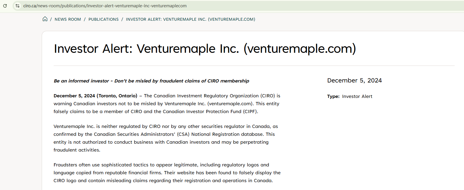 Venturemaple appears to have emerged recently, with its domain registered in late October 2024. It is prudent to stick with established, major brokers, as newcomers in the industry are either untested over time or created hastily by fraudsters to solicit investors—an increasingly common trend. We have reasons to suspect that Venturemaple falls into the latter category. It displays licensing details and regulatory information across different jurisdictions to appear legitimate, but our inquiries into these claims indicate that Venturemaple either fabricates its regulatory status or copies information from legitimate financial firms. The warning from the Investment Industry Regulatory Organization of Canada (IIROC) also highlights these suspicious points.