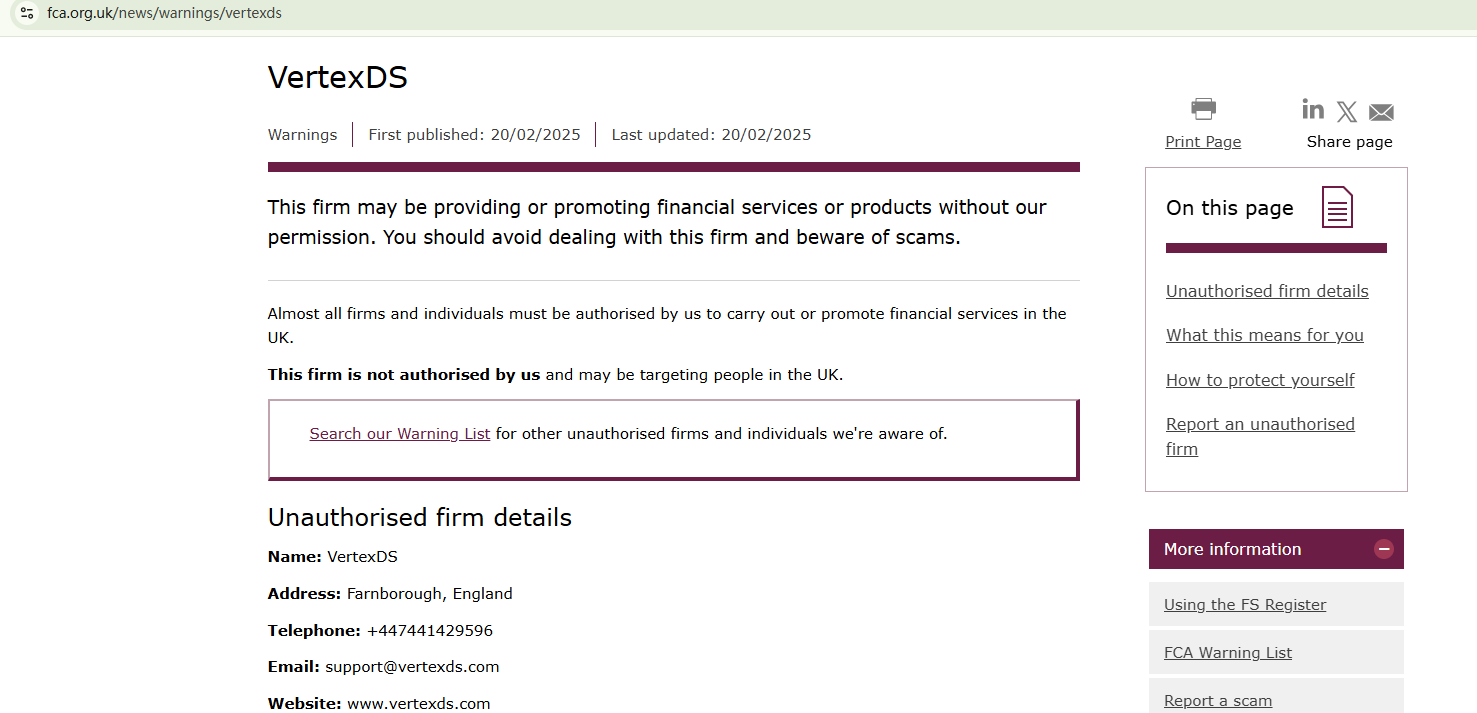 VertexDS seemsto have emerged recently, with its domain name registered in August 2024. To appear professional, the broker employs a template, which offers basic content and graphic designs for a quick setup. We haven't found any useful information or records to suggest that VertexDS is legitimate or regulated. In addition, the Financial Conduct Authority (FCA) issued a warning against VertexDS, advising investors to stay away from this unauthorized firm.