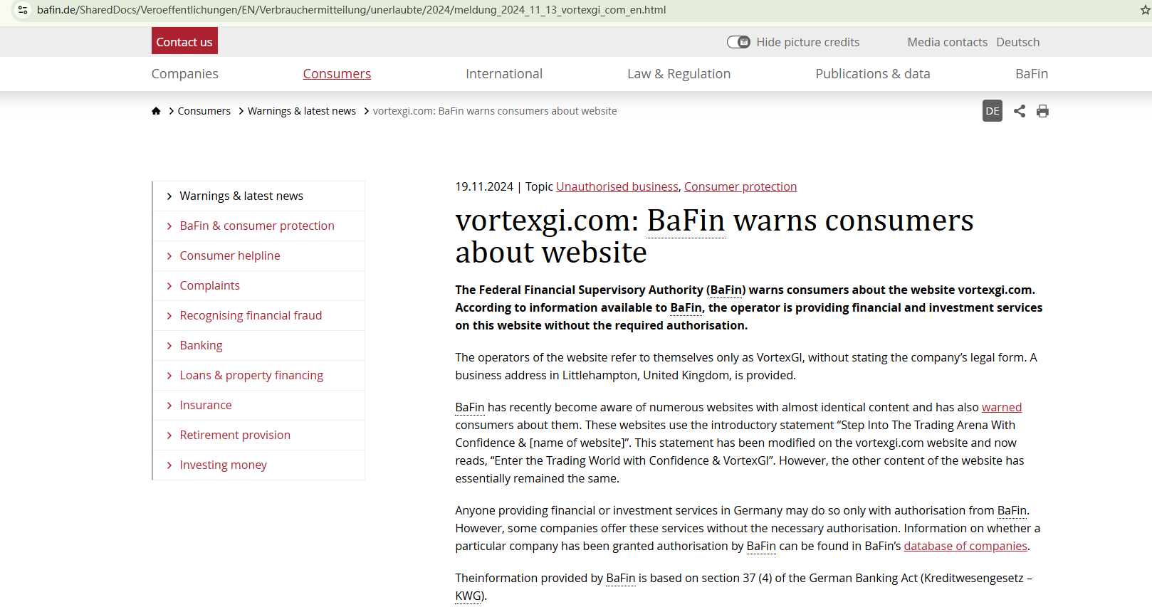 VortexGI's domain name was recently registered in September 2024, coupled with the use of a website template commonly associated with fraudulent activities, raising a red flag. The Federal Financial Supervisory Authority (BaFin) has issued a warning against VortexGI for operating without the required authorization.
