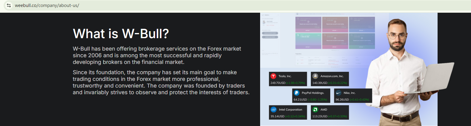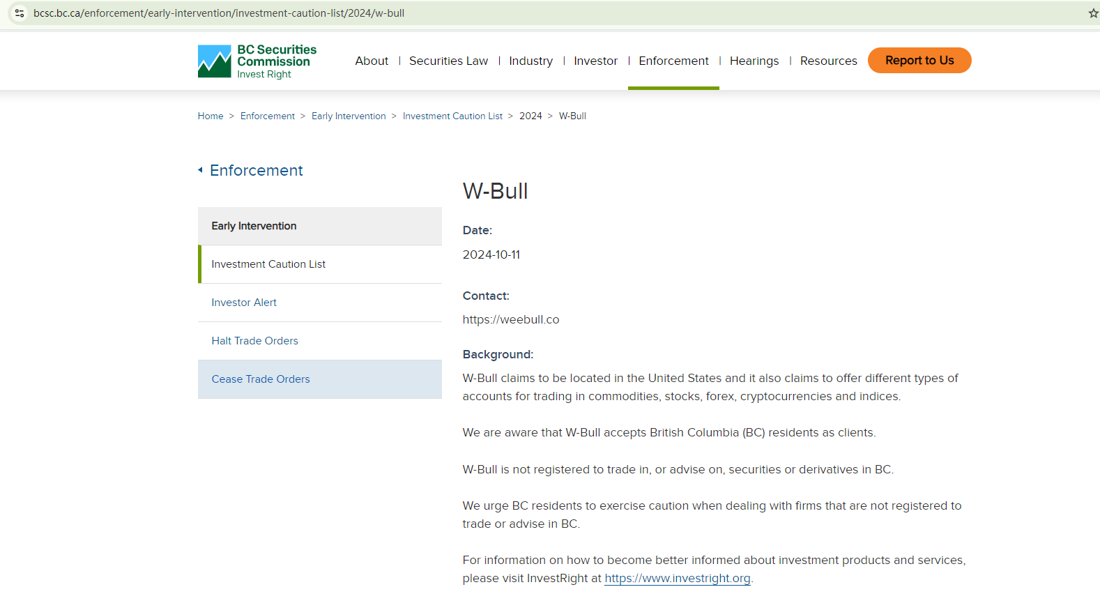 While W-bull claims to have been in business since 2006, its domain name, weebull.co, was registered as recently as late July this year, which is a red flag. The unknown operators of the site falsely purport to be WEBULL FINANCIAL LLC, a legitimate company registered with the Commodity Futures Trading Commission (CFTC). There is no evidence to suggest that W-bull (weebull.co) is affiliated with the genuine entity registered in the US. Additionally, the British Columbia Securities Commission (BCSC) has issued a warning against W-bull for providing financial services or products without proper authorization.
