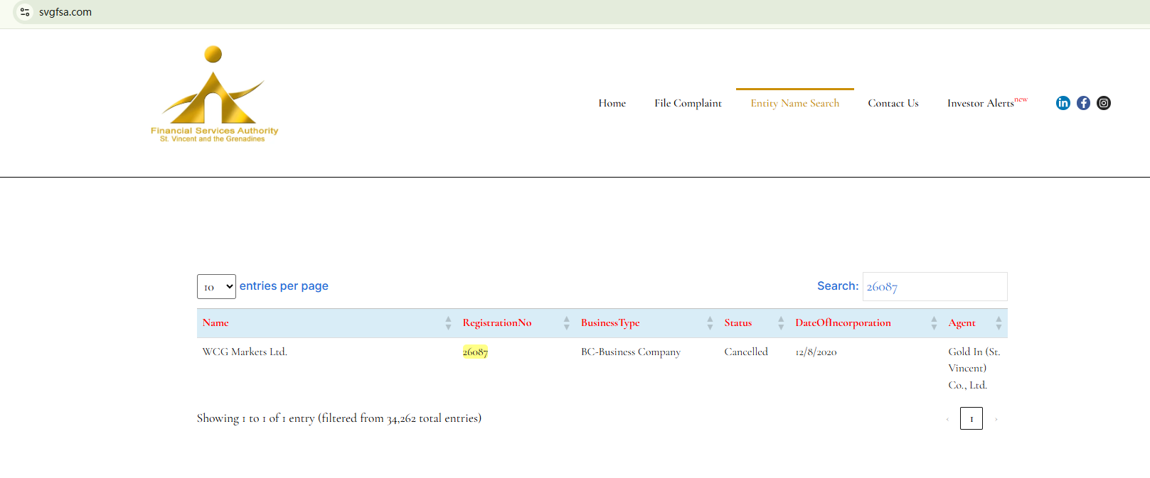 WCG Markets Ltd claims to be a forex broker, allegedly registered with the Financial Services Authority of St. Vincent and The Grenadines (SVG FSA) under number 26087 BC 2020. However, our verification indicates that this registration has been canceled.