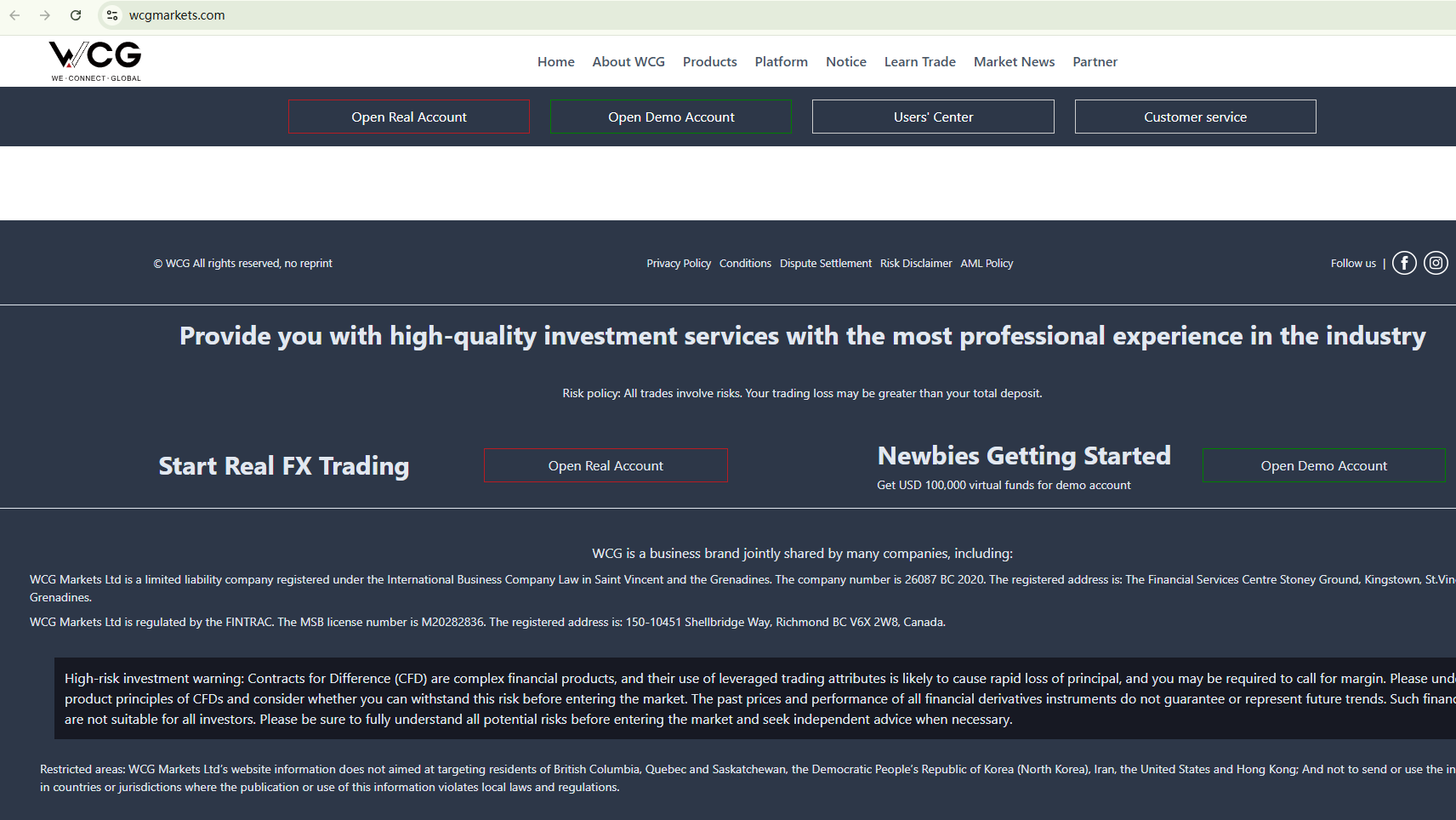 WCG Markets Ltd claims to be a forex broker, allegedly registered with the Financial Services Authority of St. Vincent and The Grenadines (SVG FSA) under number 26087 BC 2020. However, our verification indicates that this registration has been canceled. While the broker purports to be registered with the Financial Transactions and Reports Analysis Centre of Canada (FINTRAC), it is critical to note that this institution doesn't have the authority to license or regulate forex trading activities. In essence, WCG Markets Ltd is not regulated by any governing body. Entrusting it with investors' funds is highly risky, as there are no legal protections in place to safeguard the funds. WCG Markets Ltd appears to be a scam.