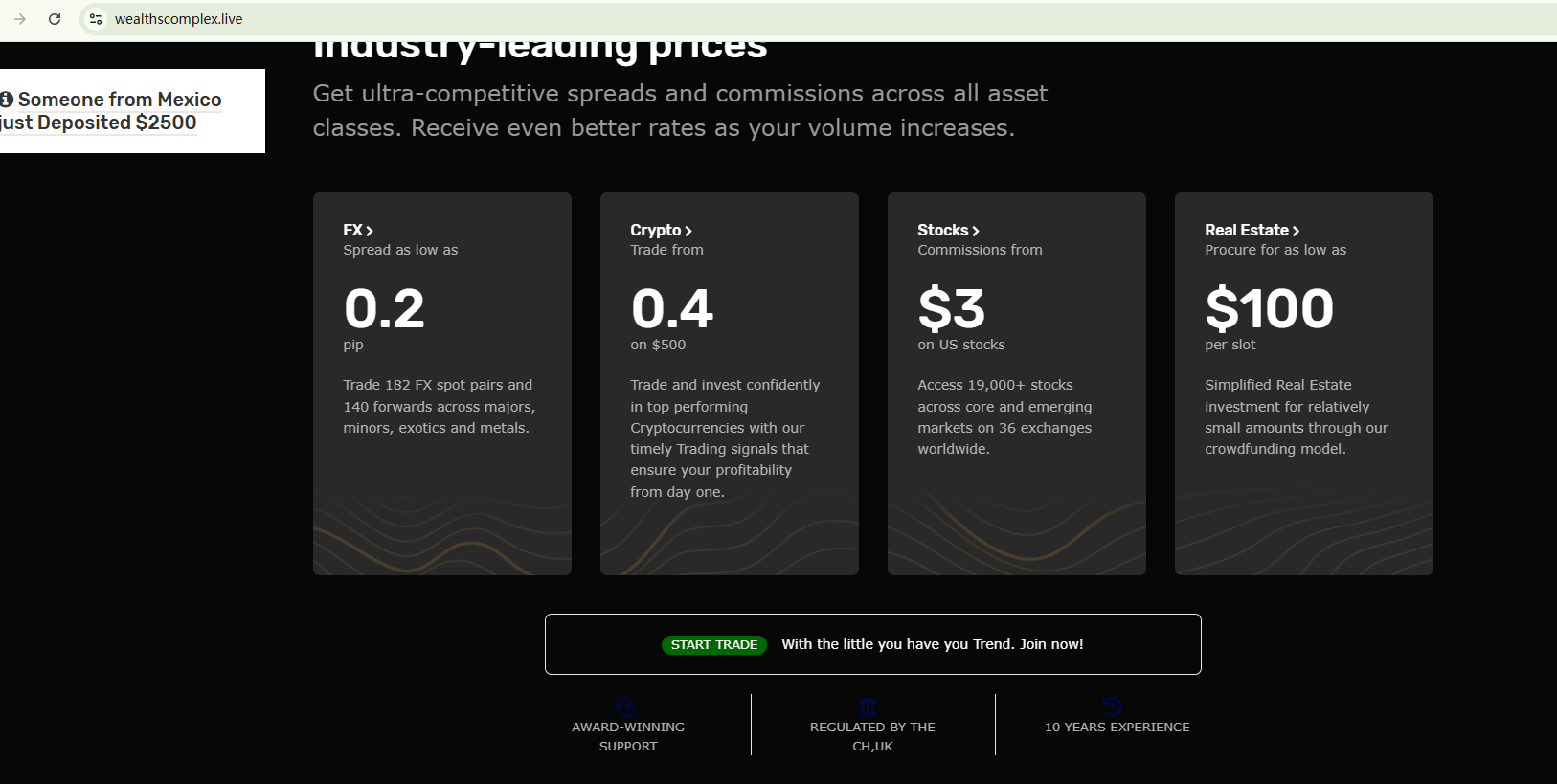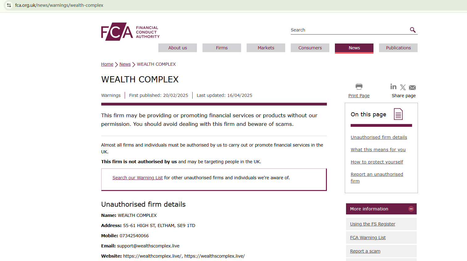 WEALTH COMPLEX claims to be a broker regulated in the UK, but the reality tells a different story. The FInancial Conduct Authority (FCA) has issued a warning about WEALTH COMPLEX, noting that the entity is not regulated by them and advising investors to stay away from it.