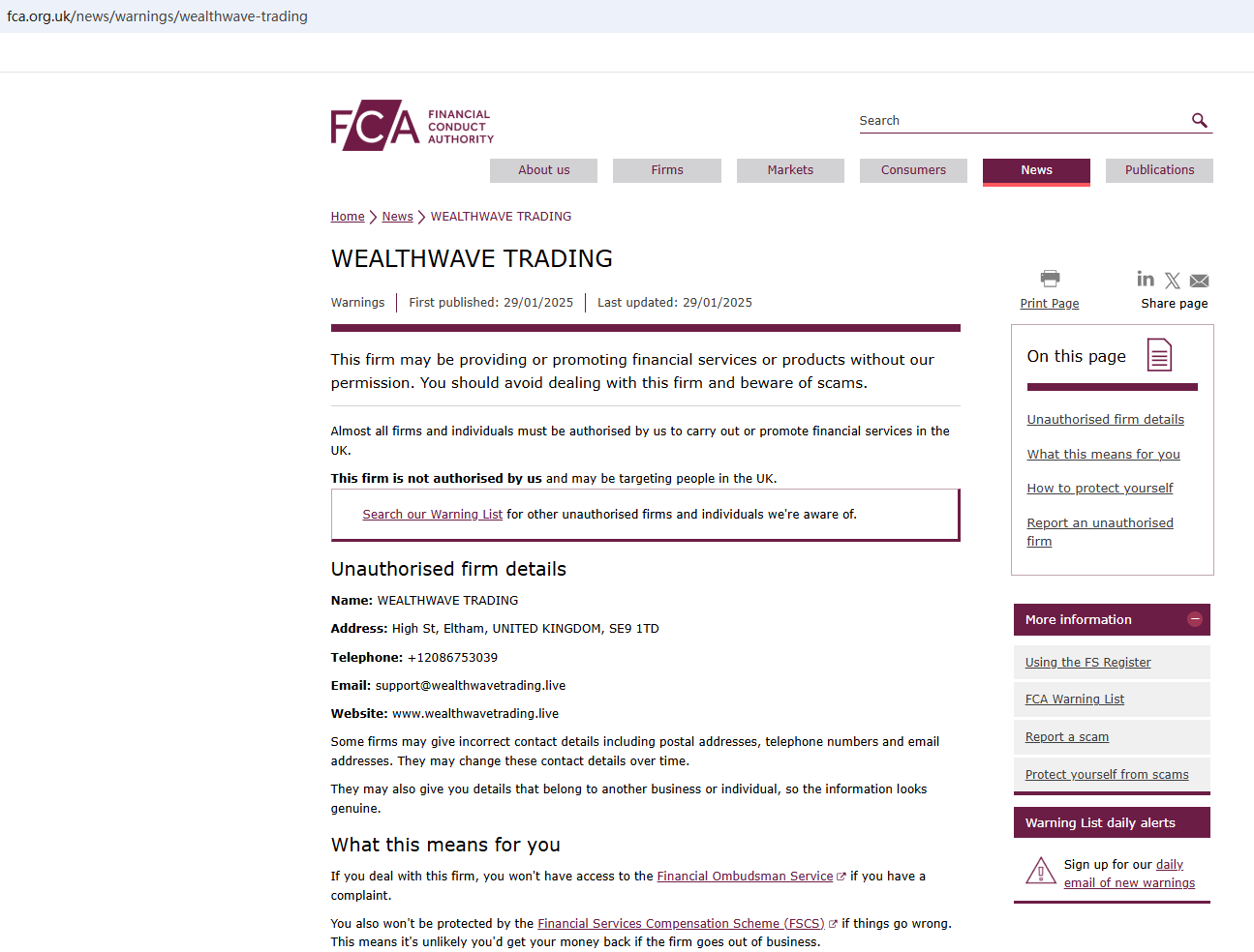 In addition, its address is in the UK, we found that the Financial Conduct Authority (FCA) issued a warning against WEALTHWAVE TRADING, believing this company might be providing financial services or products without proper authorization in the UK.