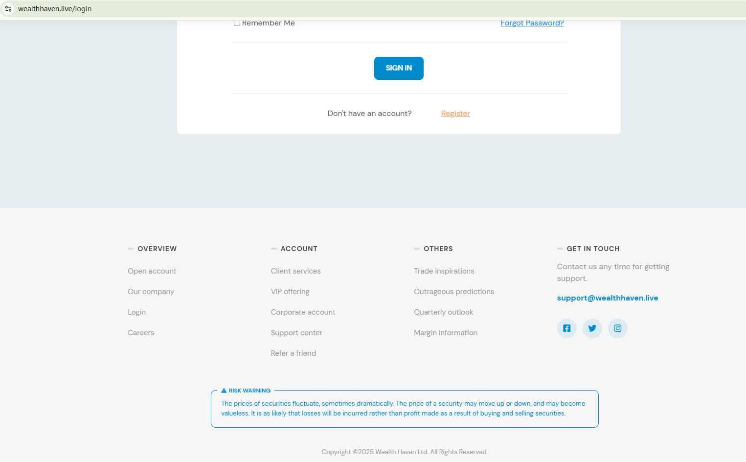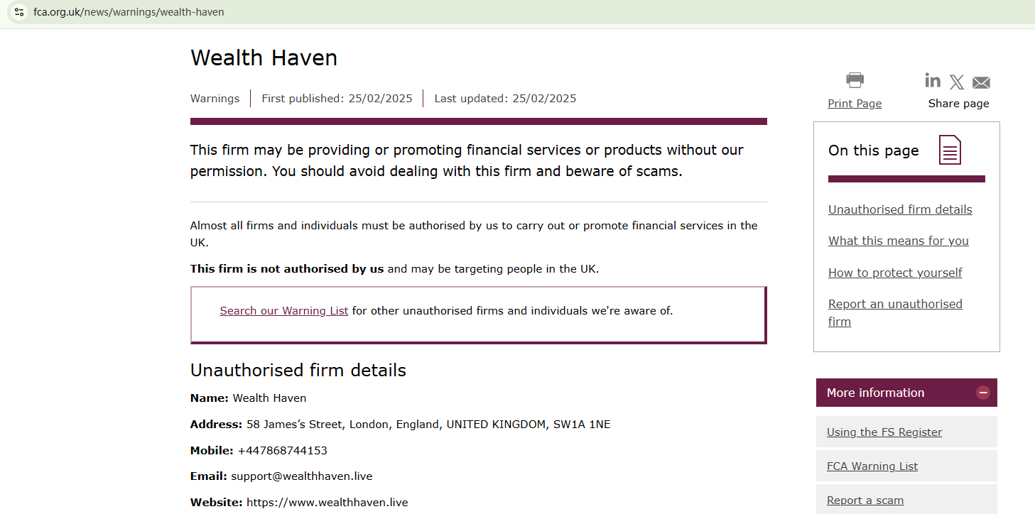 Wealth Haven doesn't disclose any useful information to suggest that it is legitimate or regulated. It even conceals basic information about their identity, not showing their address or phone numbers. The Financial Conduct Authority (FCA) has issued a warning against Wealth Haven, advising investors to stay away from the unauthorized financial firm.
