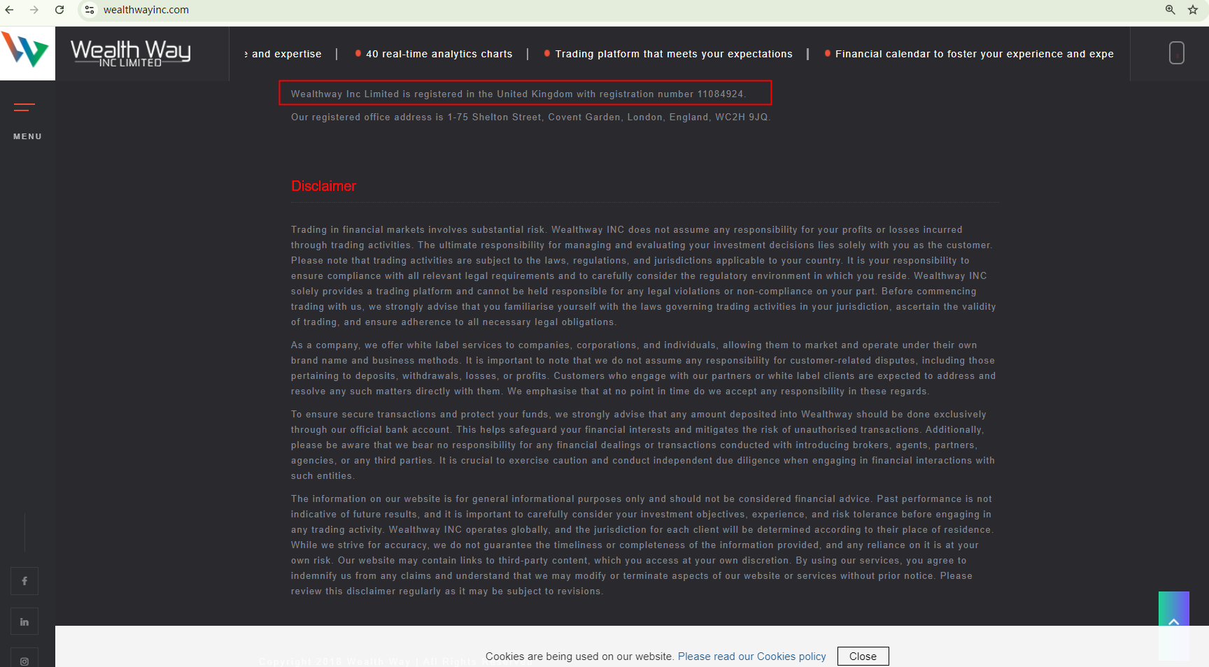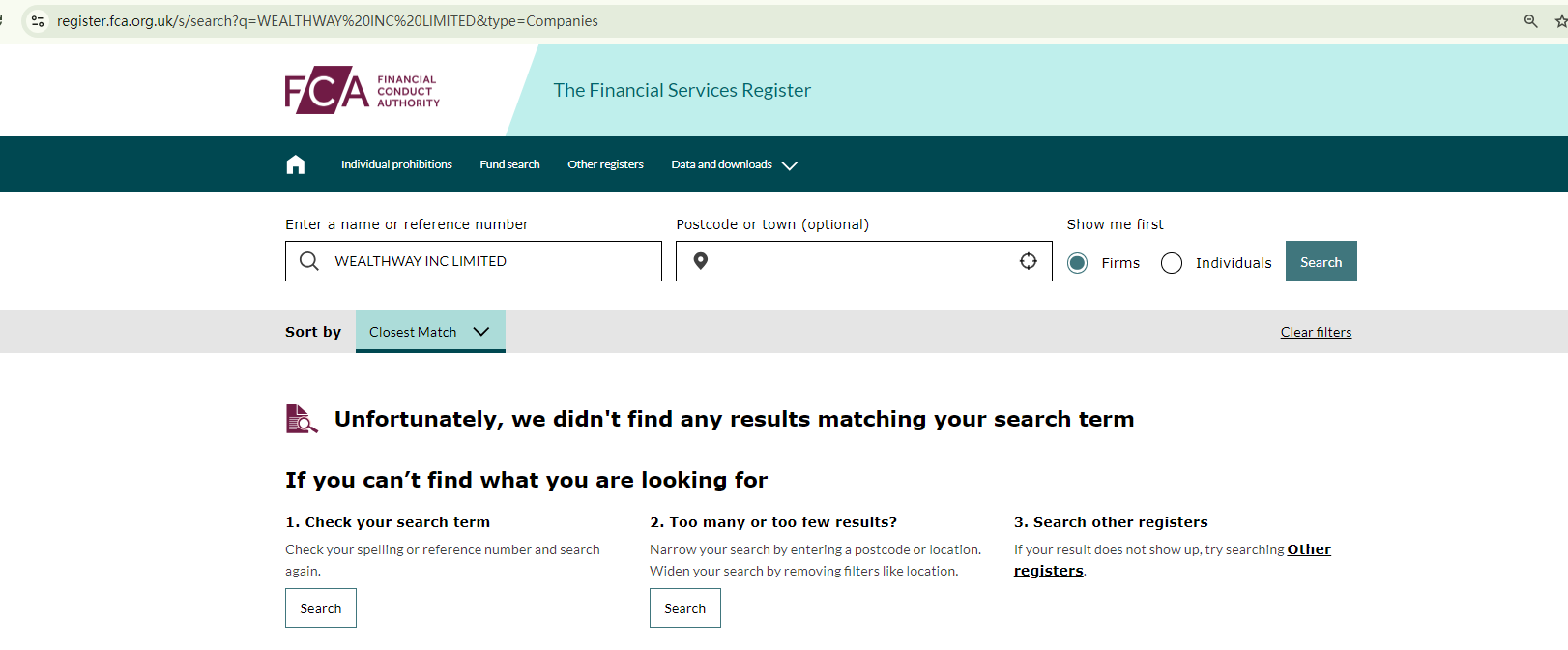Wealthway Inc Limited claims to be registered in the UK and displays a company number from Companies House (CH) to prove its legitimacy. However, it is important to note that mere registration with CH does not equate to authorization from a financial regulator. Our search for the company in the Financial Conduct Authority (FCA) register did not yield any matching results, indicating that the company is not permitted to carry out licensed activities in the country.