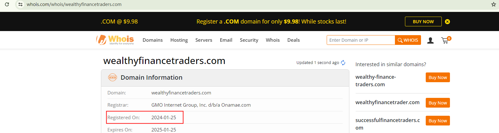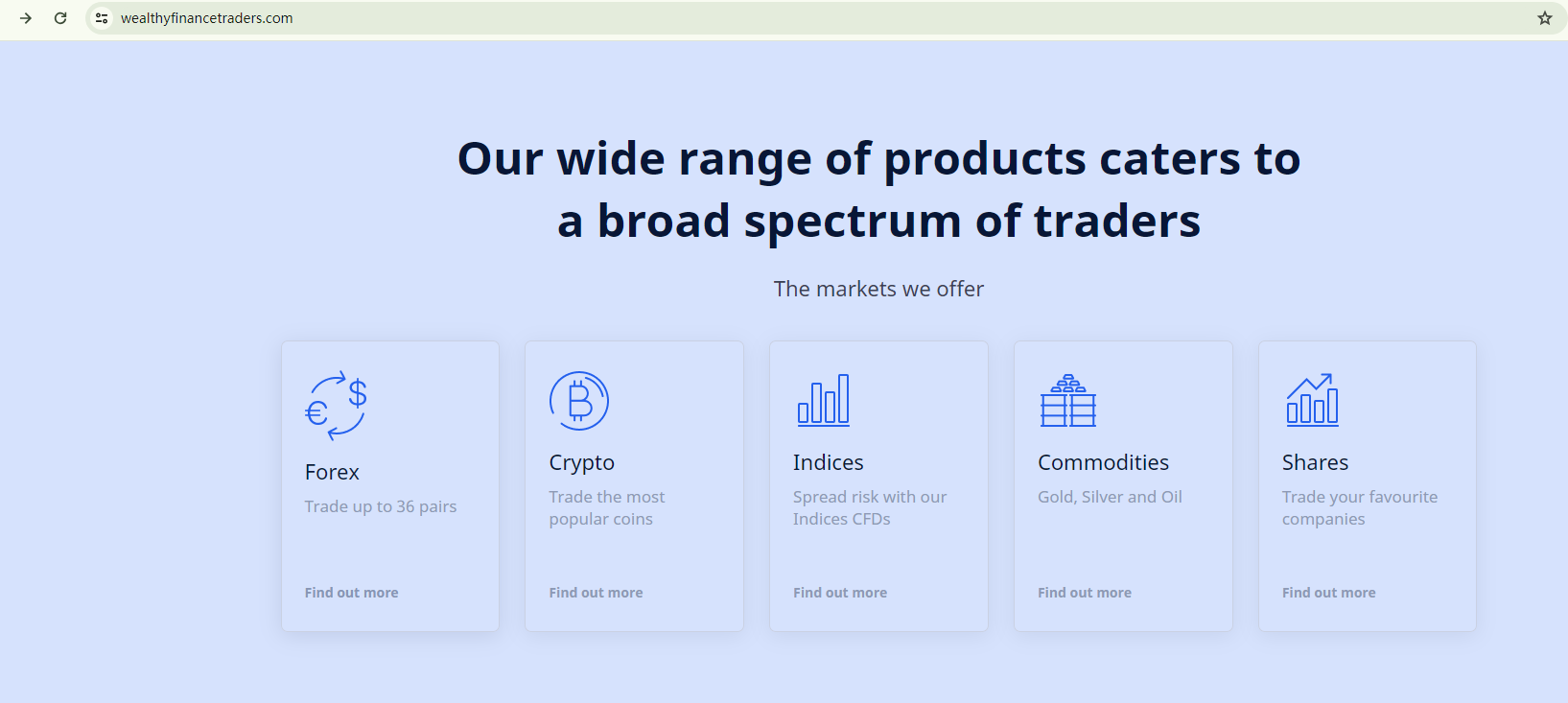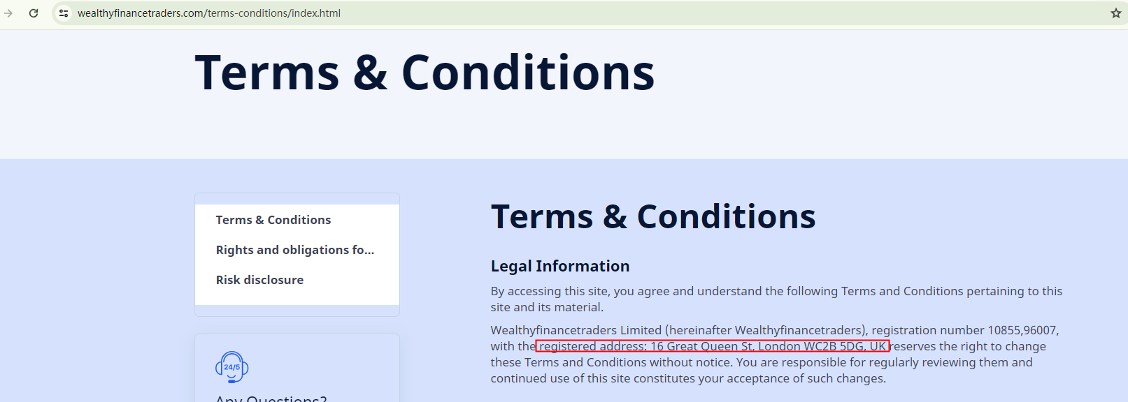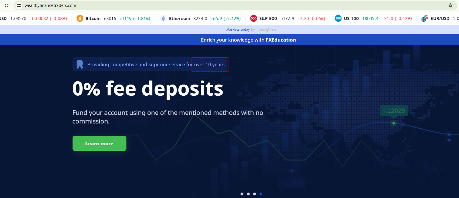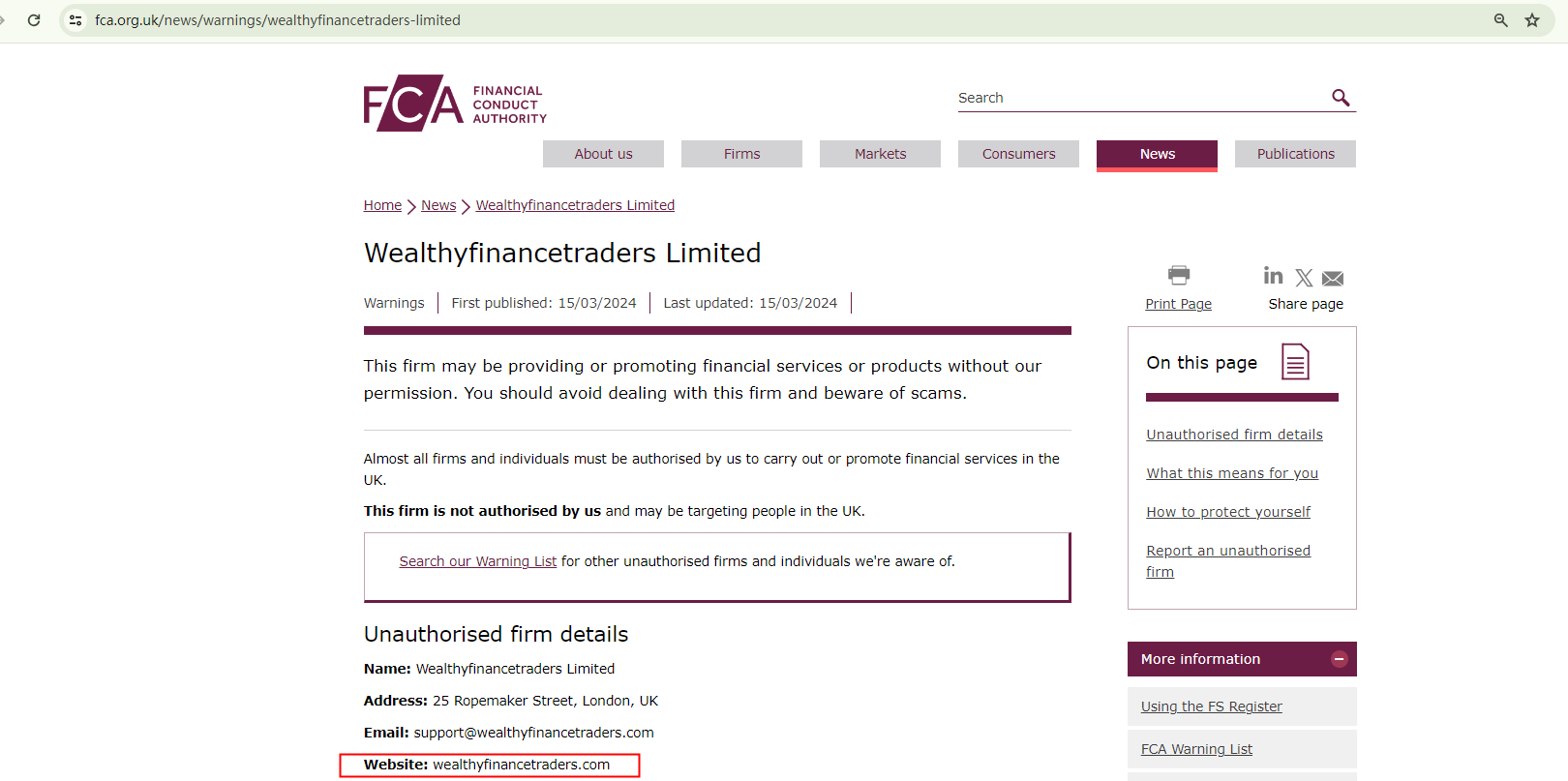 While this company claims to be based in the UK, the Financial Conduct Authority (FCA) has issued a warning and red-flagged it as an unauthorized firm in the country. This suggests that its provision of financial services is not legitimate.In addition, despite the claims of having been providing financial services for over 10 years, its domain name was recently registered in January 2024. This discrepancy undermines the company's credibility.In essence, Wealthyfinancetraders Limited is not regulated by any governing body. Entrusting it with investors' funds is highly risky, as there are no legal protections in place to safeguard the funds.Wealthyfinancetraders Limited appears to be a scam.