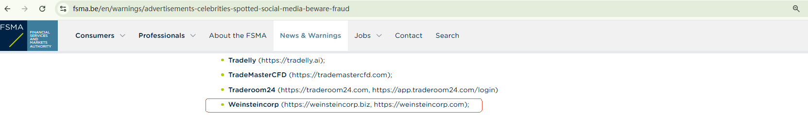 Weinsteincorp provides financial services through two website addresses, one of which is currently disabled. It claims to have been established as early as 2013, but its domain name, the still functioning one, was only registered in January 2024. This inconsistency is a red flag. The site does not disclose useful company information, making it almost anonymous and difficult to hold accountable. Additionally, the Belgian Financial Services and Markets Authority (FSMA) has added Weinsteincorp to its warning list as a fraudulent trading platform operating in the Belgian market and advised investors to stay away from it.