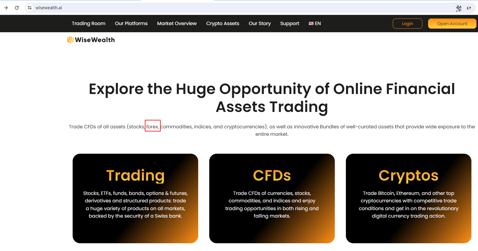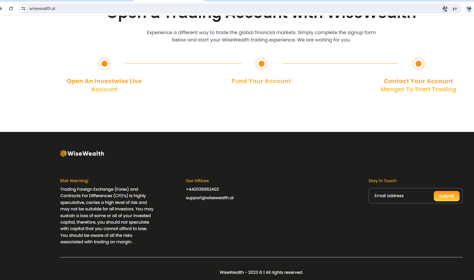 WiseWealth claims to be a reliable company without presenting any information about its regulation. The lack of such important information may be a distinct signal of an unlicensed broker, as regulated companies always present their accreditations and licenses in a prominent position. It is a red flag.