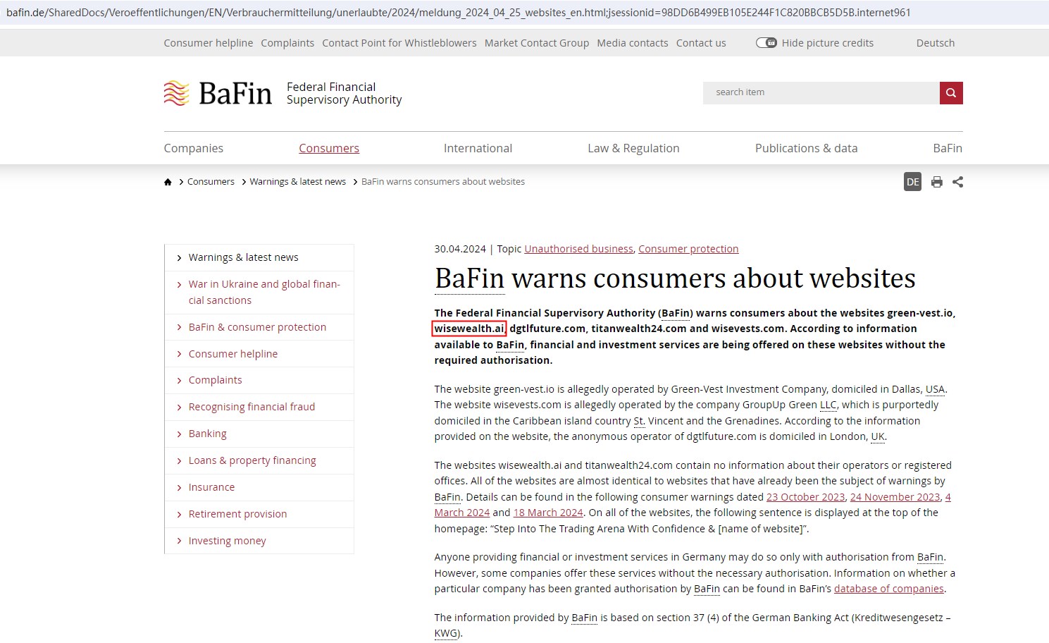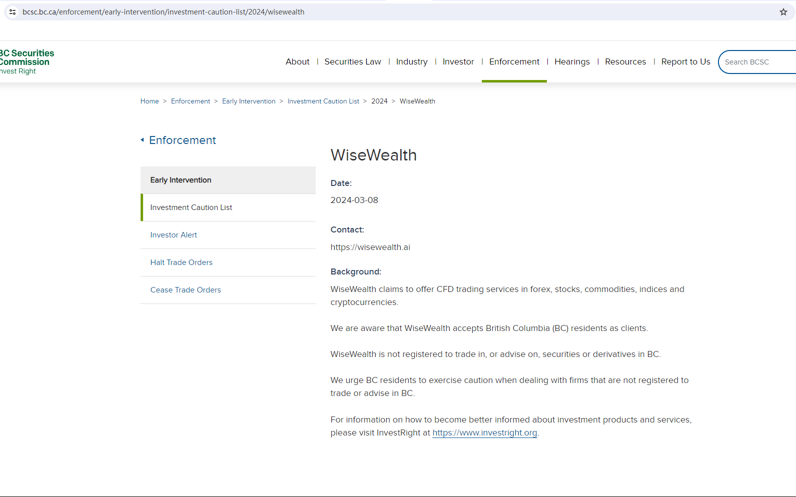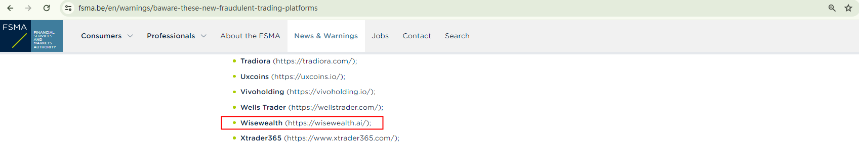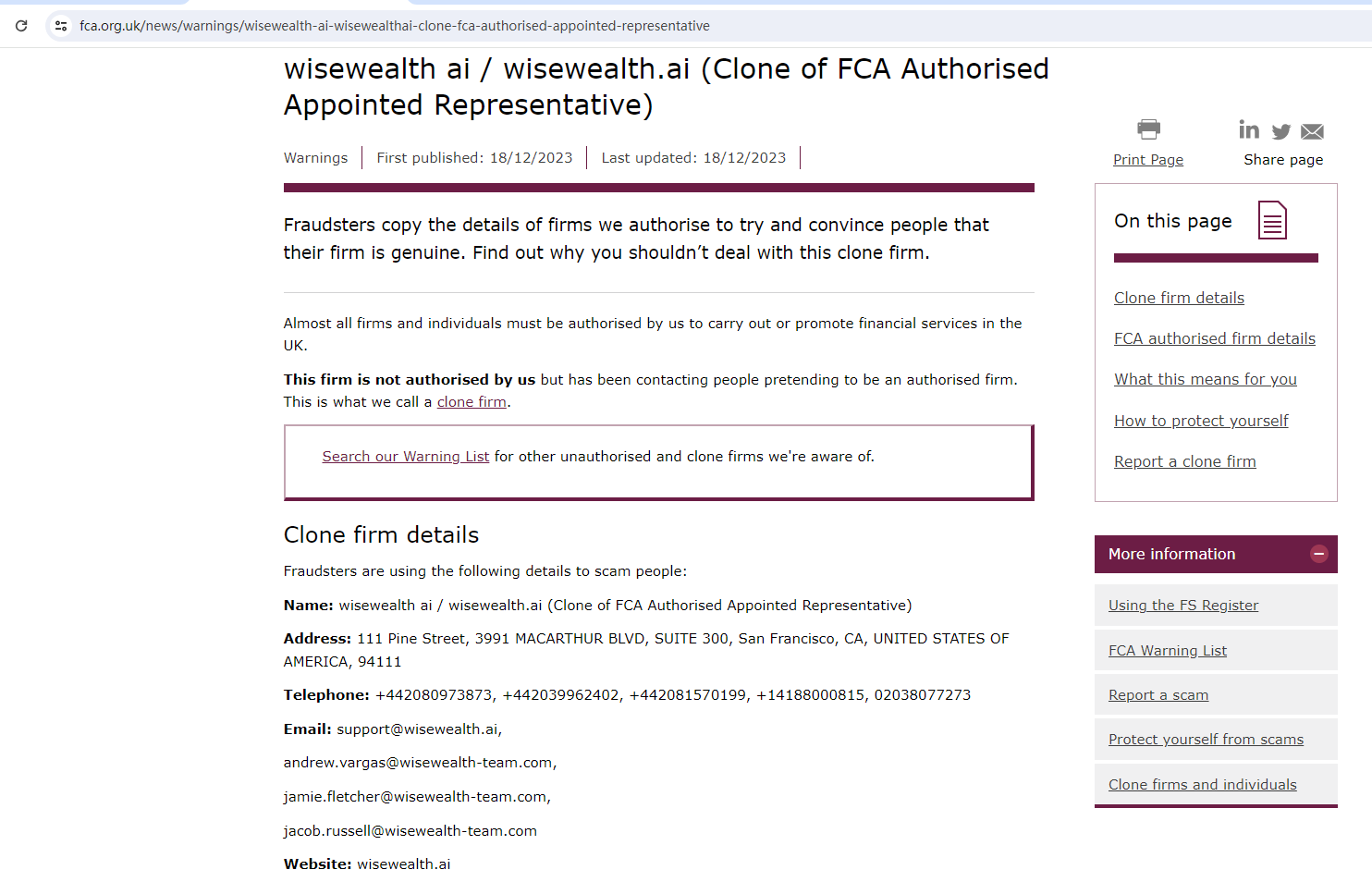 The United Kingdom Financial Conduct Authority (UK FCA) issued a warning that WiseWealt was a clone of FCA Authorised Appointed Representative, Wise Wealth Management Ltd.