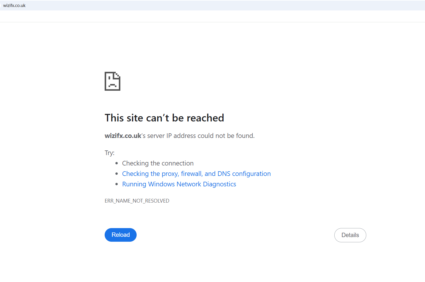 BrokersView found that the domain "wizifx.co.uk" is currently inaccessible. This is widely regarded as a significant red flag, as the suspension of a broker's website often points to underlying regulatory or operational issues.