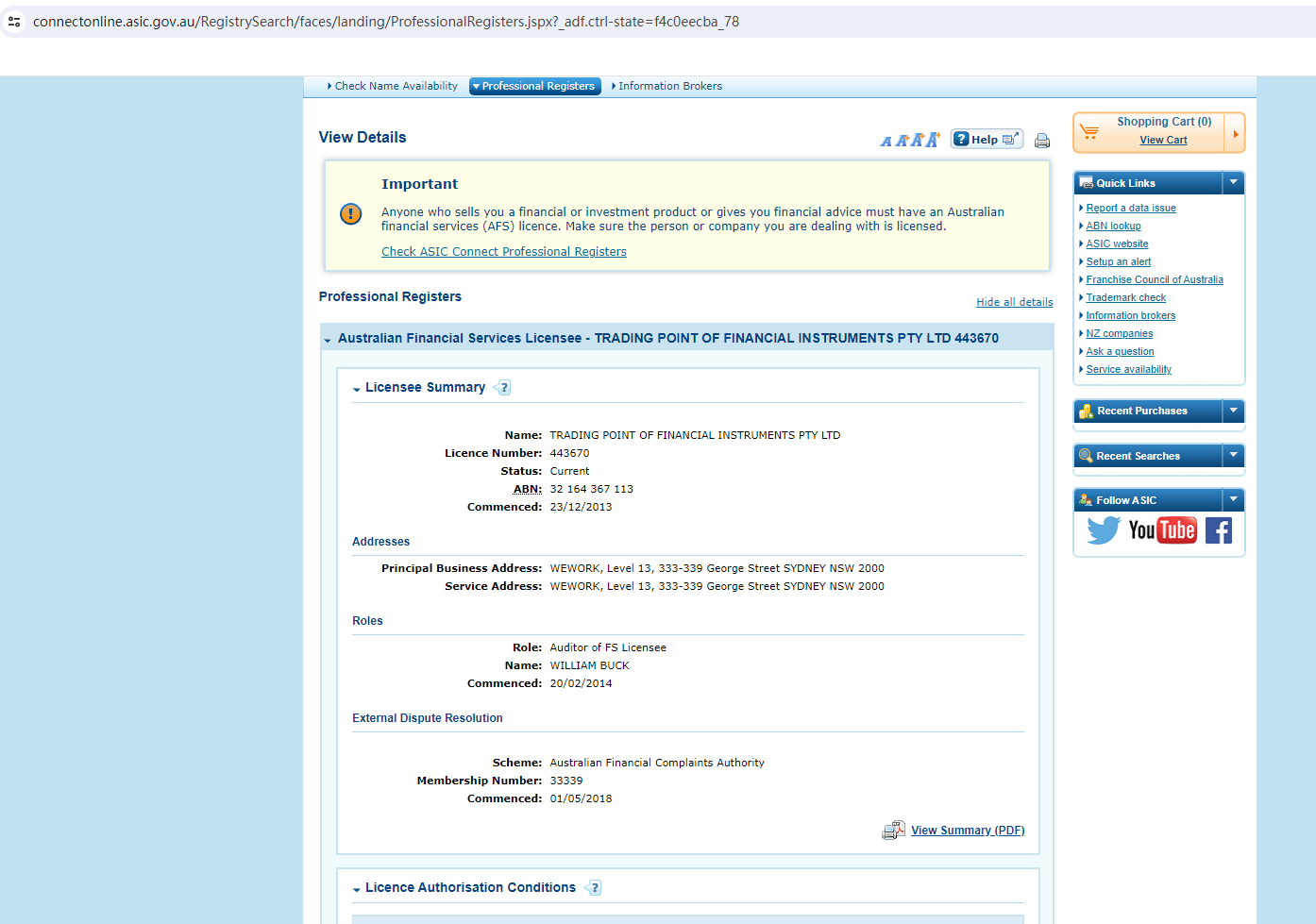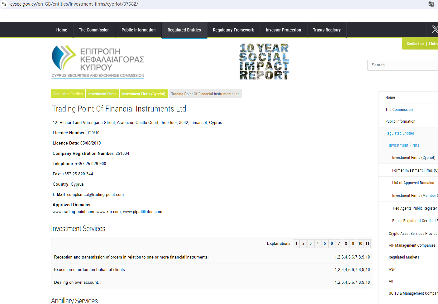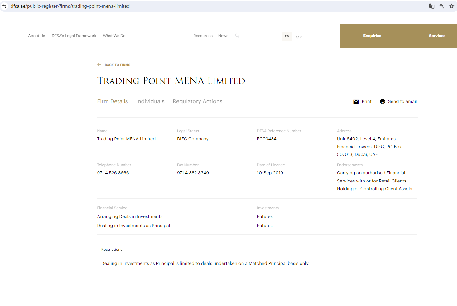 According to its website, it claims regulated by the Australian Securities & Investments Commission(ASIC) (Trading Point of Financial Instruments Pty Limited), by Cyprus Securities and Exchange Commission (CySEC) (Trading Point of Financial Instruments Ltd), by the Financial Services Commission (FSC) (XM Global Limited) and by the Dubai Financial Services Authority (DFSA) (Trading Point MENA Limited). Upon investigation, we did not find matching information in FSC, but we found relevant information in ASIC, CySEC, and DFSA. After careful comparison, we found that the registration address and website address in the regulatory agency were inconsistent with XM Trade, which was stolen information of compliant brokers.