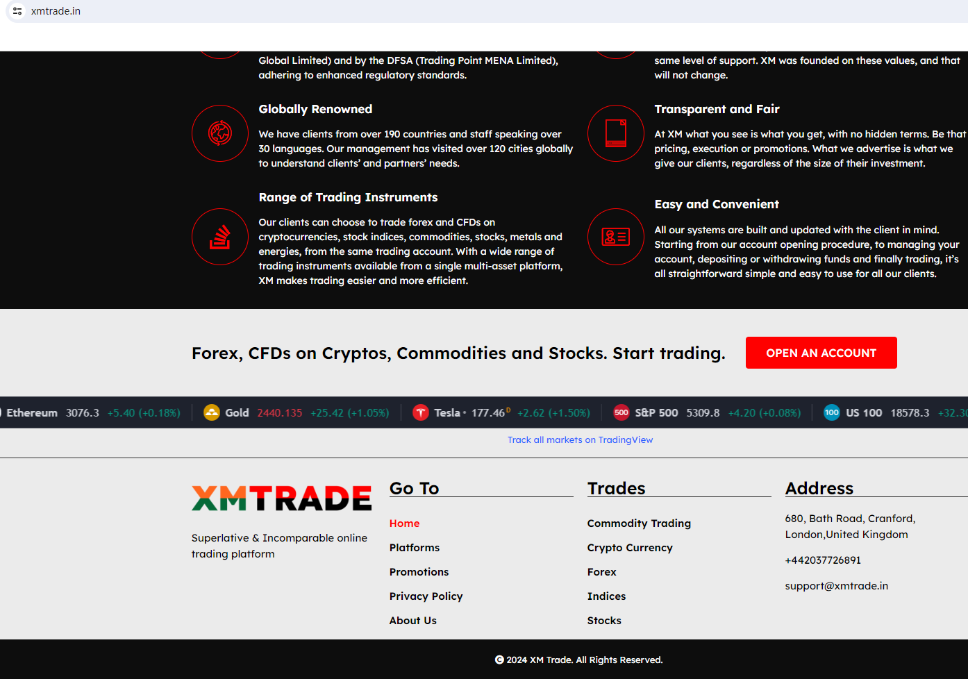 According to its website, it claims regulated by the Australian Securities & Investments Commission(ASIC) (Trading Point of Financial Instruments Pty Limited), by Cyprus Securities and Exchange Commission (CySEC) (Trading Point of Financial Instruments Ltd), by the Financial Services Commission (FSC) (XM Global Limited) and by the Dubai Financial Services Authority (DFSA) (Trading Point MENA Limited). Upon investigation, we did not find matching information in FSC, but we found relevant information in ASIC, CySEC, and DFSA. After careful comparison, we found that the registration address and website address in the regulatory agency were inconsistent with XM Trade, which was stolen information of compliant brokers. In addition, it's located in the UK. However, no matching information was found in the Financial Conduct Authority (FCA).In conclusion, XM Trade is definitively a scam. Investors are strongly advised to steer clear of it.