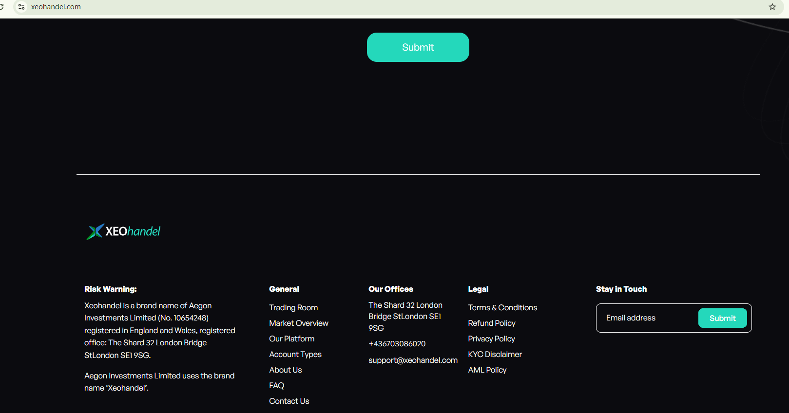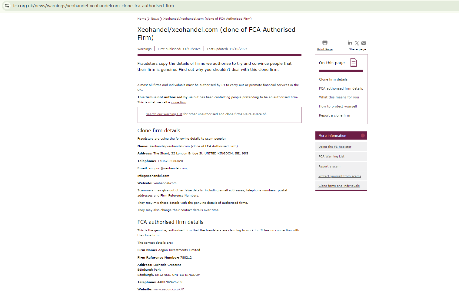 Xeohandel claims to be the brand name of Aegon Investments Limited and uses their company information to appear legitimate. However, Aegon Investments Limited is a British firm authorized by the Financial Conduct Authority (FCA) and has no connection to Xeohandel, according to the UK's financial watchdog. Xeohandel is unauthorized and deliberately creates the false impression of being affiliated with an FCA-regulated company to mislead investors. This is a clear case of identity theft, making Xeohandel an imposter website.