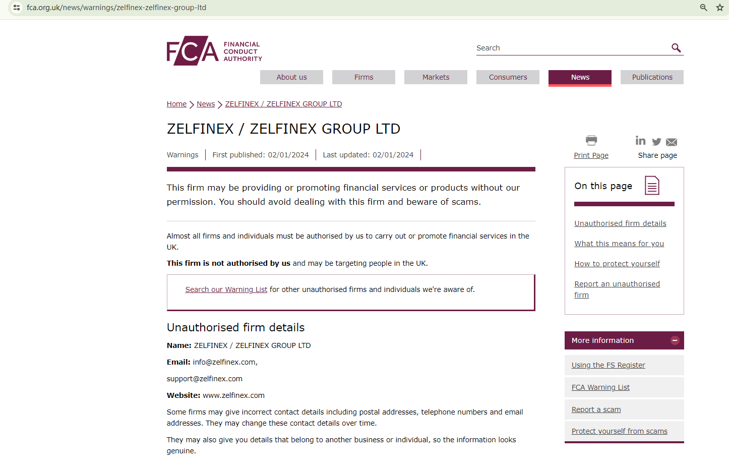 What's more, the Financial Conduct Authority (FCA) has issued a warning against ZELFINEX, believing this company might be providing financial services or products without proper authorization in the UK.