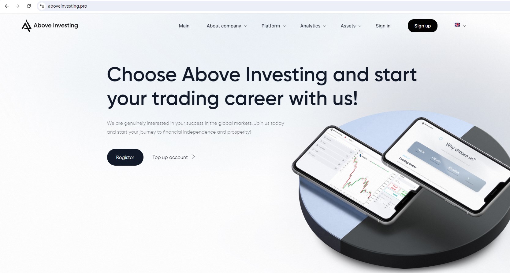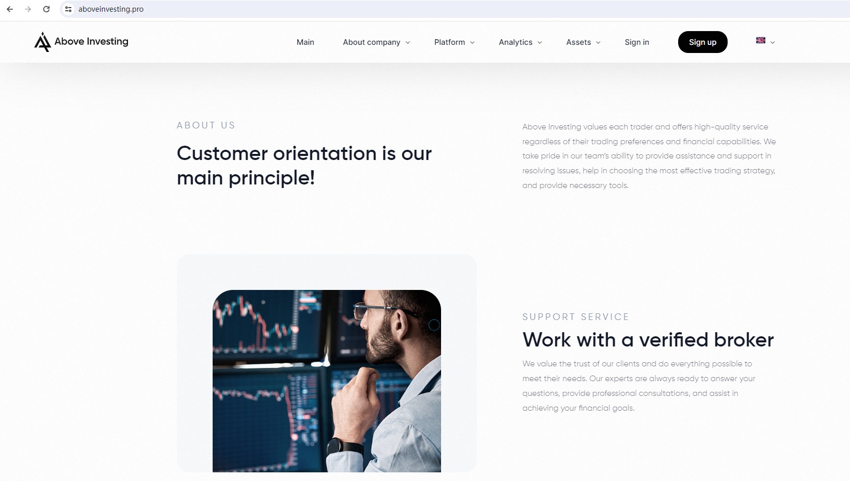 Above Investing claims to be a reliable company without presenting any information about its regulation or contact. The lack of such important information may be a distinct signal of an unlicensed broker, as regulated companies always present their accreditations and licenses in a prominent position. It is a red flag.