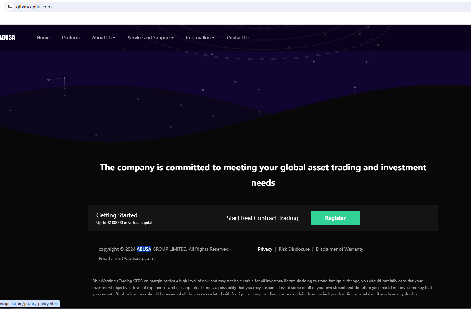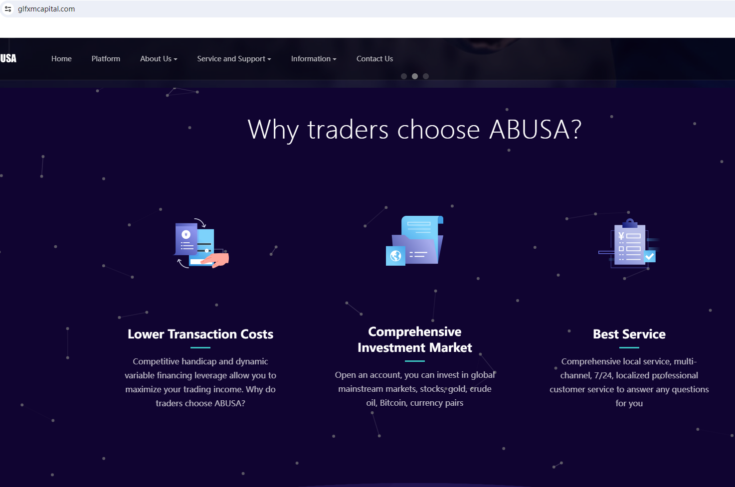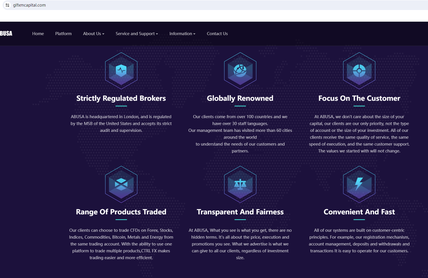 According to its website, it is located in the London. Upon investigation, no matching information was found in the Financial Conduct Authority (FCA). Moreover, it cliams regulated by Financial Crimes Enforcement Network (FinCEN), we found the matching information in the FinCEN. However, mere registration with the FinCEN doesn't mean being authorized to provide financial services or products in the USA legally. More importantly, we searched for NFA and did not find any matching information.Furthermore, the Securities And Futures Commission(SFC) issued a warning against ABUSA, believing this company might be providing financial services or products without proper authorization in the HK.In essence, ABUSA is not regulated by any governing body. Entrusting it with investors' funds is highly risky, as there are no legal protections in place to safeguard the funds.ABUSA appears to be a scam.