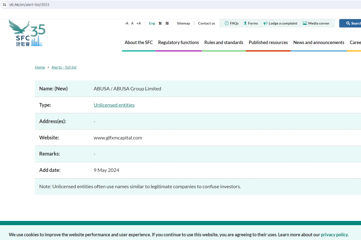Furthermore, the Securities And Futures Commission(SFC) issued a warning against ABUSA, believing this company might be providing financial services or products without proper authorization in the HK.