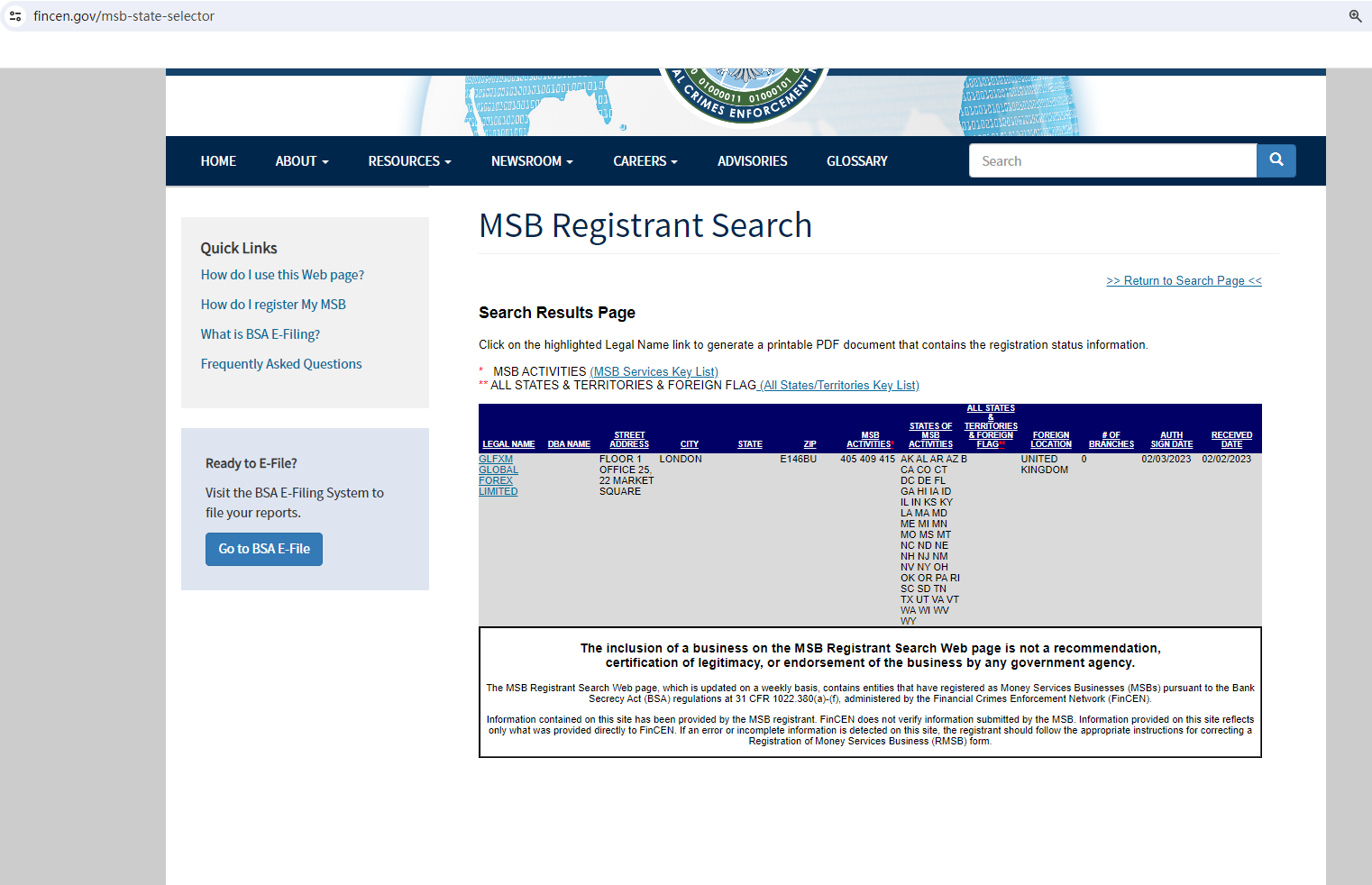 According to its website, it is located in the London. Upon investigation, no matching information was found in the Financial Conduct Authority (FCA). Moreover, it cliams regulated by Financial Crimes Enforcement Network (FinCEN), we found the matching information in the FinCEN. However, mere registration with the FinCEN doesn't mean being authorized to provide financial services or products in the USA legally. More importantly, we searched for NFA and did not find any matching information.