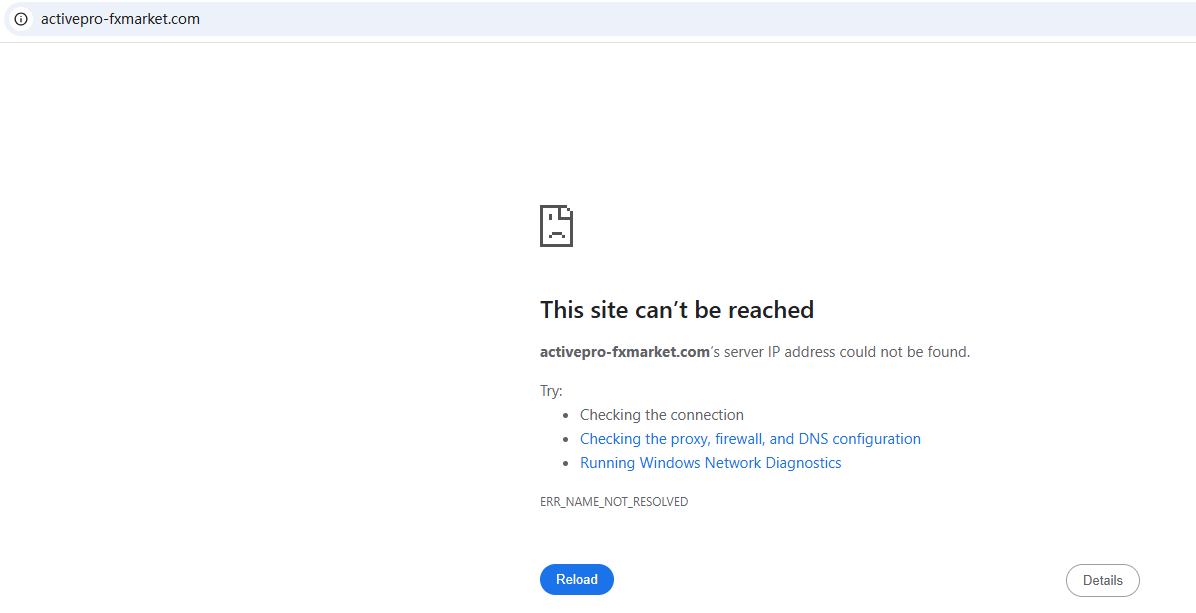 BrokersView found that the domain "https://activepro-fxmarket.com/" is currently inaccessible. This is widely regarded as a significant red flag, as the suspension of a broker's website often points to underlying regulatory or operational issues.