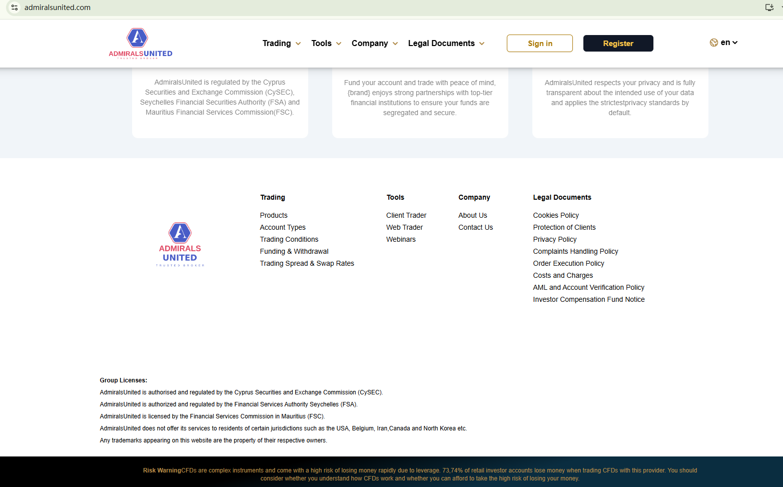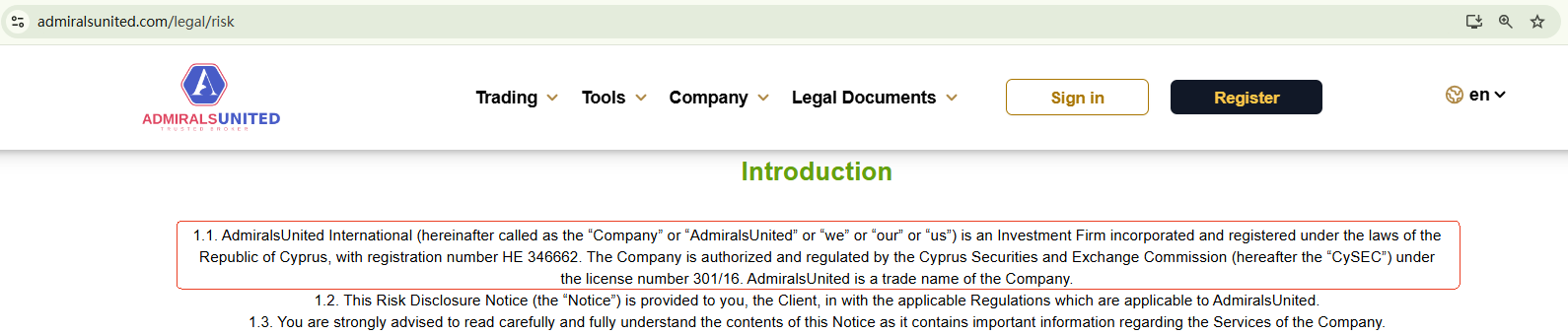 The domain name of AdmiralsUnited was registered in June 2024, indicating that the platform likely just emerged. This is a red flag. Their regulatory statements align with their image of being a newly launched platform, vaguely claiming to be regulated across different jurisdictions yet failing to provide detailed licensing information to prove their legitimacy. Our search of the financial regulators' registers that AdmiralsUnited mentions reveals that the broker either fabricates its regulatory status or copies information from other companies to appear genuine. The true identity of the company behind AdmiralsUnited remains unknown. Therefore, it is no surprise that the Italian Companies and Exchange Commission (CONSOB) has ordered AdmiralsUnited's website to be blacked out.In essence, AdmiralsUnited is not regulated by any governing body. Entrusting it with investors' funds is highly risky, as there are no legal protections in place to safeguard the funds.AdmiralsUnited appears to be a scam.