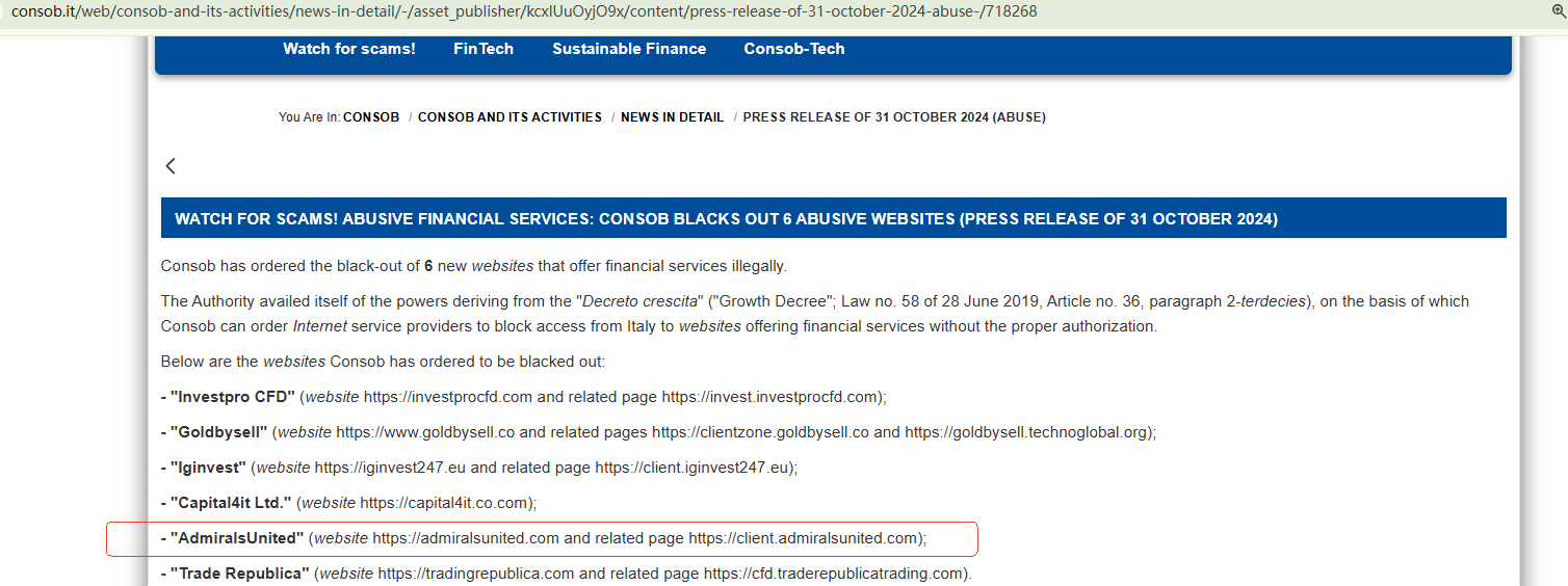 • 2024-10-30 The CONSOB blacklists AdmiralsUnited for illegal services