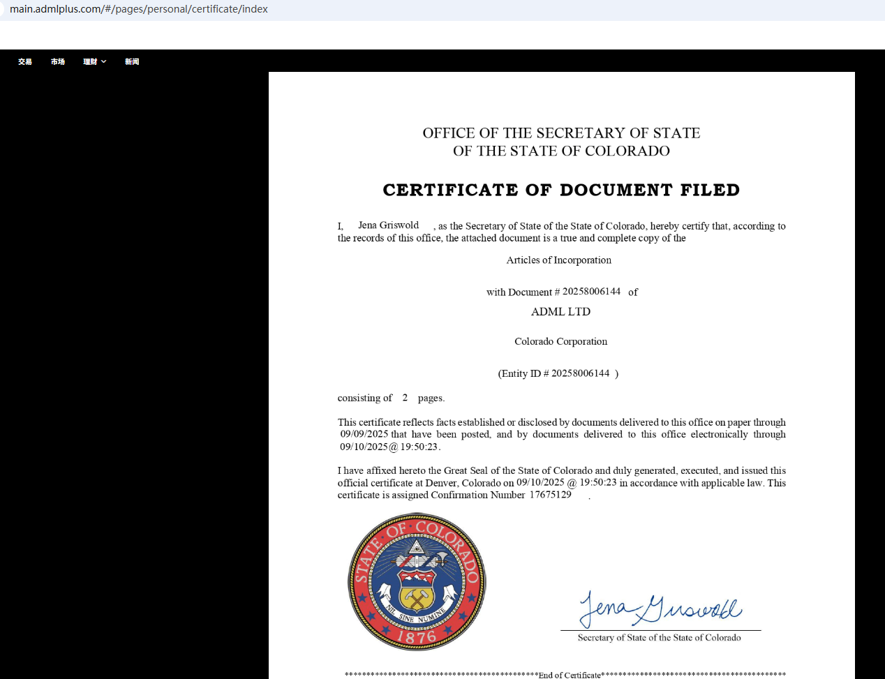 According to its website, the company claims to be reliable. It displays a Colorado certificate on its website, but in reality, this certificate does not grant it the authority to regulate foreign exchange. Furthermore, a search of the National Futures Association (NFA) yielded no matching information. More notably, the Securities Commission Malaysia (SC) issued a warning regarding ADML, suspecting that this company may be offering financial services or products without the necessary authorization.
