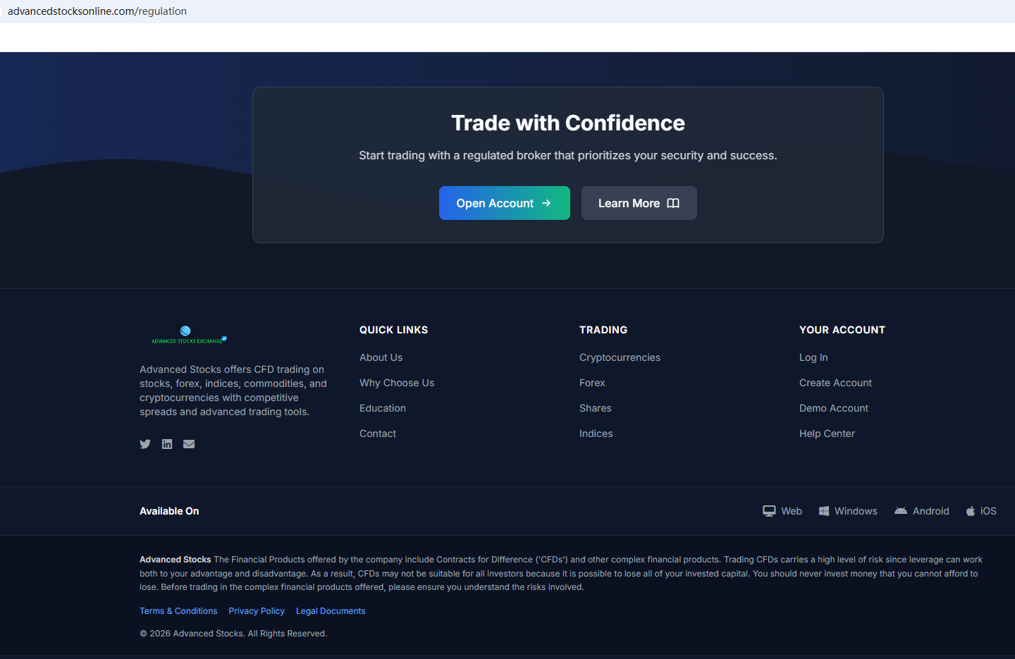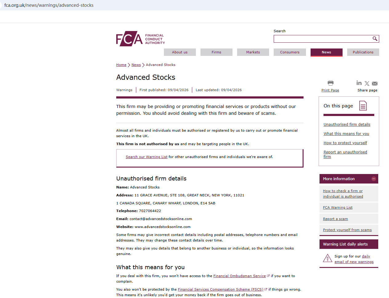 On April 9, 2026, the Financial Conduct Authority (FCA) issued a warning regarding Advanced Stocks, suspecting that this company may be offering financial services or products without the necessary authorization. https://www.fca.org.uk/news/warnings/advanced-stocks